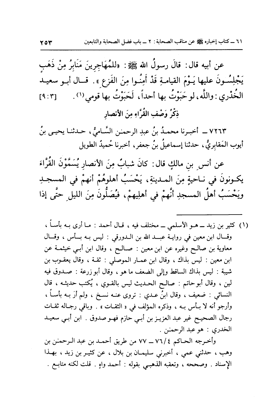 7263- أَخْبَرَنَا مُحَمَّدُ بْنُ عَبْدِ الرَّحْمَنِ السَّامِيُّ حَدَّثَنَا يَحْيَى بْنُ أَيُّوبَ الْمَقَابِرِيُّ حَدَّثَنَا إِسْمَاعِيلُ بْنُ جَعْفَرٍ أَخْبَرَنَا حُمَيْدٌ الطَّوِيلُ عَنْ أَنَسِ بْنِ مَالِكٍ قَالَ: كَانَ شَبَابٌ مِنَ الْأَنْصَارِ يُسَمَّوْنَ الْقُرَّاءَ يَكُونُونَ فِي نَاحِيَةٍ مِنَ الْمَدِينَةِ يَحْسَبُ أَهْلُوهُمْ أَنَّهُمْ في المجد وَيُحْسَبُ أَهْلُ الْمَسْجِدِ أَنَّهُمْ فِي أَهْلِيهِمْ فَيُصَلُّونَ مِنَ اللَّيْلِ حَتَّى إِذَا