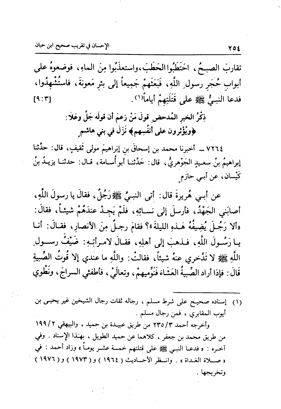 7264- أَخْبَرَنَا مُحَمَّدُ بْنُ إِسْحَاقَ بْنِ إِبْرَاهِيمَ مَوْلَى ثَقِيفٍ قَالَ: حَدَّثَنَا إِبْرَاهِيمُ بْنُ سَعِيدٍ الْجَوْهَرِيُّ قَالَ: حَدَّثَنَا أَبُو أُسَامَةَ قَالَ: حَدَّثَنَا يَزِيدَ بْنِ كَيْسَانَ عَنْ أَبِي حَازِمٍ عَنْ أَبِي هُرَيْرَةَ قَالَ: أَتَى النَّبِيَّ صَلَّى اللَّهُ عَلَيْهِ وَسَلَّمَ فَقَالَ: يَا رَسُولَ اللَّهِ أَصَابَنِي الْجَهْدُ فَأَرْسَلَ إِلَى نِسَائِهِ فَلَمْ يَجِدْ عِنْدَهُمْ شَيْئًا, فَقَالَ: "أَلَا رَجُلٌ يُضَيِّفُهُ هَذِهِ اللَّيْلَةَ"؟ فَقَامَ رَجُلٌ مِنَ الْأَنْصَارِ فَقَالَ: أَنَا يَا رَسُولَ اللَّهِ فَذَهَبَ إِلَى أَهْلِهِ فَقَالَ لِامْرَأَتِهِ: ضَيْفُ رَسُولُ اللَّهِ صَلَّى اللَّهُ عَلَيْهِ وَسَلَّمَ لَا تَدَّخِرِي عَنْهُ شَيْئًا فَقَالَتْ: وَاللَّهِ مَا عِنْدِي إِلَّا قُوتُ الصِّبْيَةِ, قَالَ: فَإِذَا أَرَادَ الصِّبْيَةُ الْعَشَاءَ فَنَوِّمِيهِمْ وَتَعَالِي فَأَطْفِئِي السَّرَّاجَ وَنَطْوِي