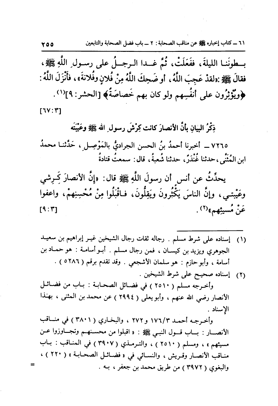 7265- أَخْبَرَنَا أَحْمَدُ بْنُ الْحَسَنِ الْجَرَادِيُّ بِالْمَوْصِلِ حَدَّثَنَا مُحَمَّدُ بْنُ الْمُثَنَّى حَدَّثَنَا غُنْدَرٌ حَدَّثَنَا شُعْبَةُ قَالَ سَمِعْتُ قَتَادَةَ يُحَدِّثُ عَنْ أَنَسٍ: أَنَّ رَسُولَ اللَّهِ صَلَّى اللَّهُ عَلَيْهِ وَسَلَّمَ قَالَ: "إِنَّ الْأَنْصَارَ كَرِشِي وَعَيْبَتِي وَإِنَّ النَّاسَ يَكْثِرُونَ وَيَقِلُّونَ فاقبلوا من محسنهم واعفوا عن مسيئهم" 1. [3: 9]
