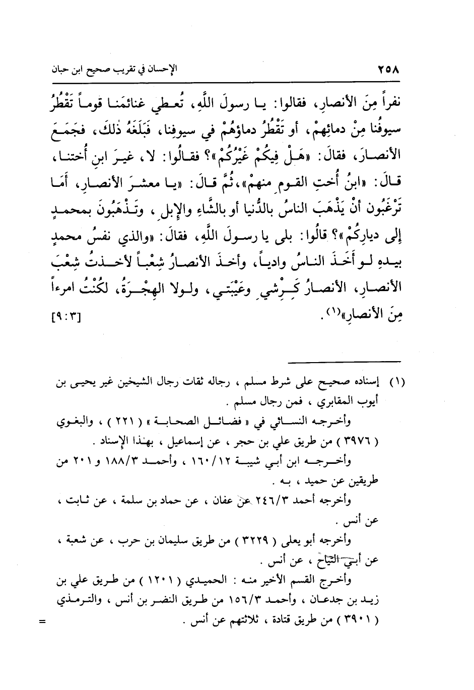 نَفَرًا مِنَ الْأَنْصَارِ فَقَالُوا: يَا رَسُولَ اللَّهِ، تُعْطِي غَنَائِمَنَا قَوْمًا تَقْطُرُ سُيُوفُنَا مِنْ دِمَائِهِمْ أَوْ تَقْطُرُ دِمَاؤُهُمْ فِي سُيُوفِنَا فَبَلَغَهُ ذَلِكَ فَجَمَعَ الْأَنْصَارَ, فَقَالَ: "هَلْ فِيكُمْ غَيْرُكُمْ"؟ فَقَالُوا: لا غير بن أُخْتِنَا, قَالَ: "ابْنُ أُخْتِ الْقَوْمِ مِنْهُمْ"، ثُمَّ قَالَ: "يَا مَعْشَرَ الْأَنْصَارِ أَمَا تَرْغَبُونَ أَنْ يَذْهَبَ النَّاسُ بِالدُّنْيَا أَوْ بِالشَّاءِ وَالْإِبِلِ وَتَذْهَبُونَ بِمُحَمَّدٍ إِلَى دِيَارِكُمْ"؟ قَالُوا: بَلَى يَا رَسُولَ اللَّهِ فَقَالَ: "وَالَّذِي نَفْسُ مُحَمَّدٍ بِيَدِهِ لَوْ أَخَذَ النَّاسُ وَادِيًا وَأَخَذَ الْأَنْصَارُ شِعْبًا لَأَخَذْتُ شِعْبَ الْأَنْصَارِ الْأَنْصَارُ كَرِشِي وَعَيْبَتِي وَلَوْلَا الْهِجْرَةُ لكنت امرأ من الأنصار" 1. [3: 9]
