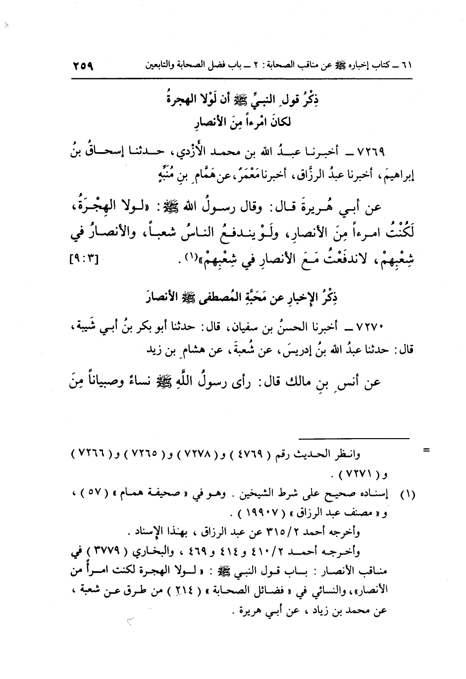 7269- أَخْبَرَنَا عَبْدُ اللَّهِ بْنُ مُحَمَّدٍ الْأَزْدِيُّ حَدَّثَنَا إِسْحَاقُ بْنُ إِبْرَاهِيمَ أَخْبَرَنَا عَبْدُ الرَّزَّاقِ أَخْبَرَنَا مَعْمَرٌ عَنْ هَمَّامِ بْنِ مُنَبِّهٍ عَنْ أَبِي هُرَيْرَةَ قَالَ: وَقَالَ رَسُولُ اللَّهِ صَلَّى اللَّهُ عَلَيْهِ وَسَلَّمَ: "لَوْلَا الْهِجْرَةُ لَكُنْتُ امْرَأً مِنَ الْأَنْصَارِ وَلَوْ يَنْدَفِعُ النَّاسُ شِعْبًا وَالْأَنْصَارُ فِي شعبهم لاندفعت مع الأنصار في شعبهم" 1. [3: 9]