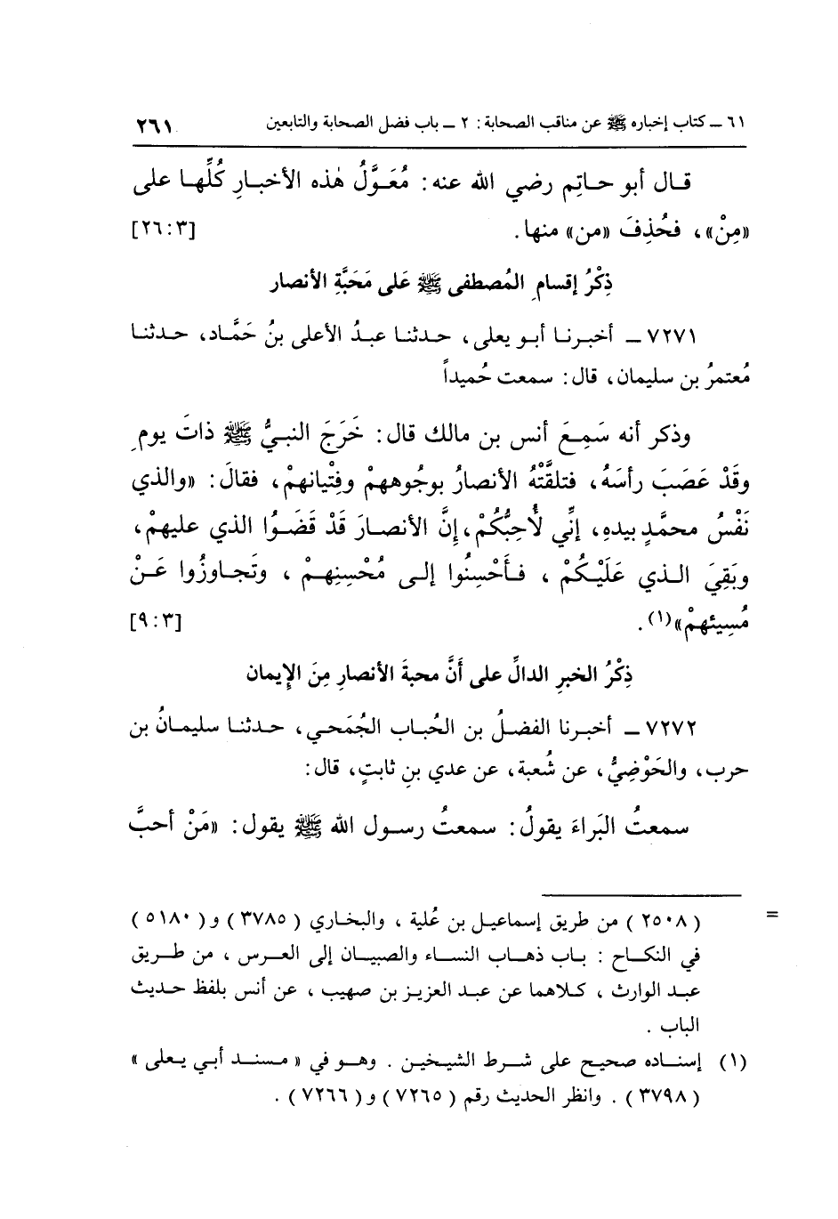 7271- اخبرا أَبُو يَعْلَى حَدَّثَنَا عَبْدُ الْأَعْلَى بْنُ حَمَّادٍ حَدَّثَنَا مُعْتَمِرُ بْنُ سُلَيْمَانَ قَالَ سَمِعْتُ حُمَيْدًا وَذَكَرَ أَنَّهُ سَمِعَ أَنَسَ بْنَ مَالِكٍ قَالَ: خَرَجَ النَّبِيُّ صَلَّى اللَّهُ عَلَيْهِ وَسَلَّمَ ذَاتَ يَوْمٍ وَقَدْ عَصَبَ رَأْسَهُ فَتَلَقَّتْهُ الْأَنْصَارُ بِوُجُوهِهِمْ وَفِتْيَانِهِمْ فَقَالَ: "وَالَّذِي نَفْسُ مُحَمَّدٍ بِيَدِهِ إِنِّي لَأُحِبُّكُمْ إِنَّ الْأَنْصَارَ قَدْ قَضَوَا الَّذِي عَلَيْهِمْ وَبَقِيَ الَّذِي عَلَيْكُمْ فَأَحْسِنُوا إِلَى مُحْسِنِهِمْ وَتَجَاوَزُوا عن مسيئهم" 1. [3: 9]