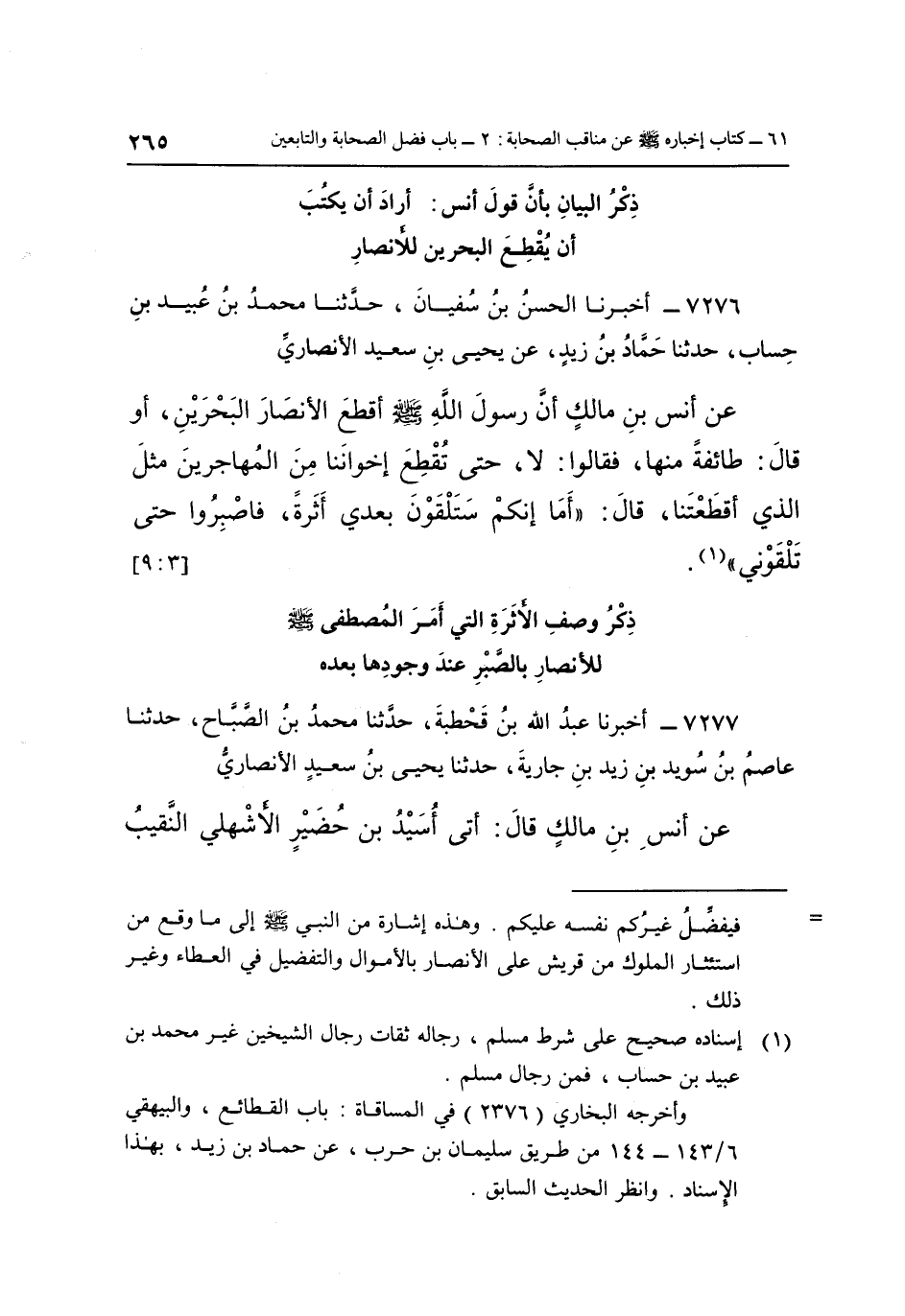 7276- أَخْبَرَنَا الْحَسَنُ بْنُ سُفْيَانَ حَدَّثَنَا مُحَمَّدُ بْنُ عُبَيْدِ بْنِ حِسَابٍ حَدَّثَنَا حَمَّادُ بْنُ زَيْدٍ عَنْ يَحْيَى بْنِ سَعِيدٍ الْأَنْصَارِيِّ عَنْ أَنَسِ بْنِ مَالِكٍ: أَنَّ رَسُولَ اللَّهِ صَلَّى اللَّهُ عليه وسلم أَقْطَعَ الْأَنْصَارَ الْبَحْرَيْنِ أَوْ قَالَ: طَائِفَةً مِنْهَا فَقَالُوا: لَا حَتَّى تُقْطِعَ إِخْوَانَنَا مِنَ الْمُهَاجِرِينَ مِثْلَ الَّذِي أَقْطَعْتَنَا قَالَ: "أَمَا إِنَّكُمْ سَتَلْقَوْنَ بعدي أثرة فاصبروا حتى تلقوني" 1. [3: 9]