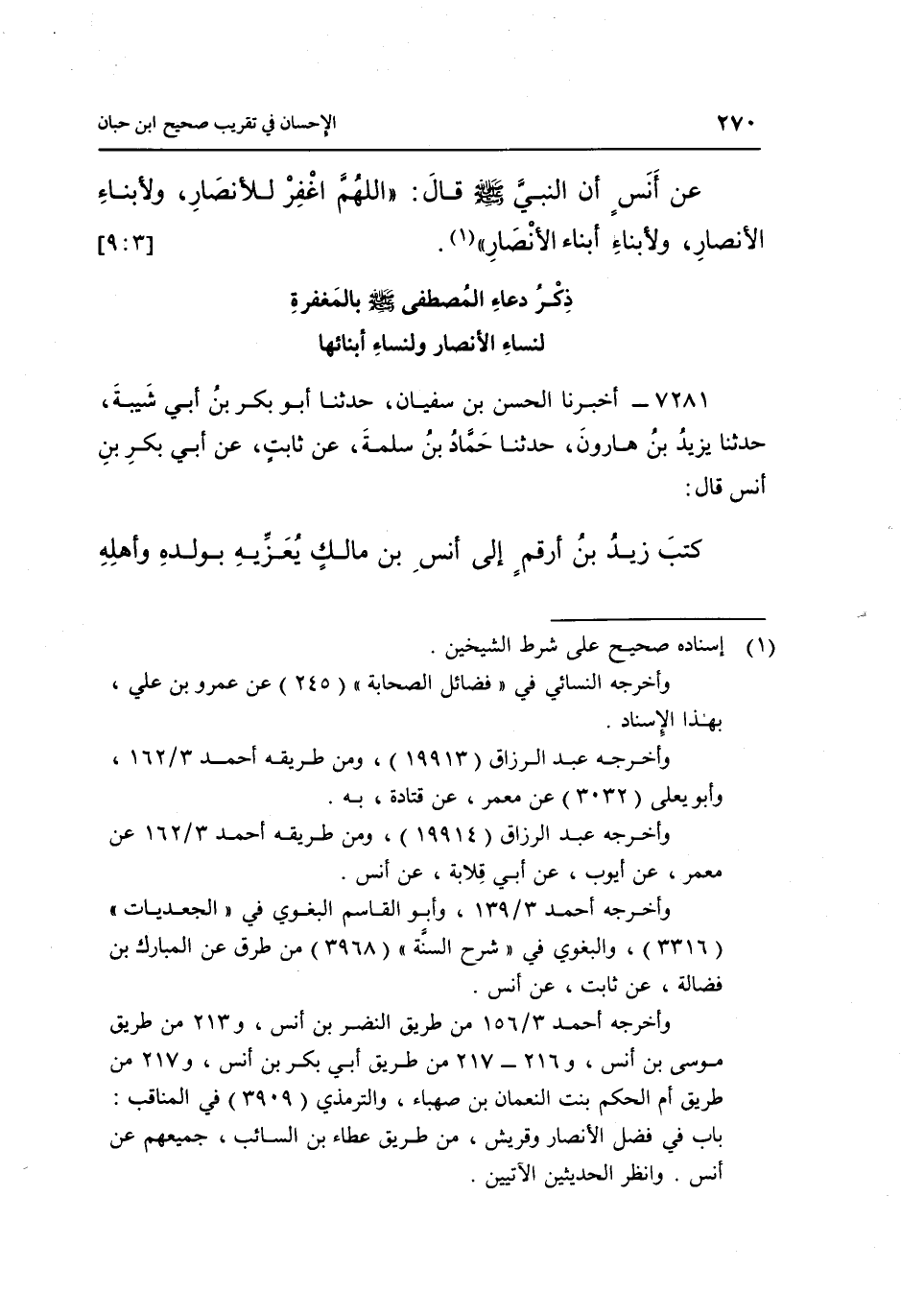 عَنْ أَنَسٍ أَنَّ النَّبِيَّ صَلَّى اللَّهُ عَلَيْهِ وَسَلَّمَ قَالَ: "اللَّهُمَّ اغْفِرْ لِلْأَنْصَارِ وَلِأَبْنَاءِ الْأَنْصَارِ ولأبناء أبناء الأنصار" 1. [3: 9]