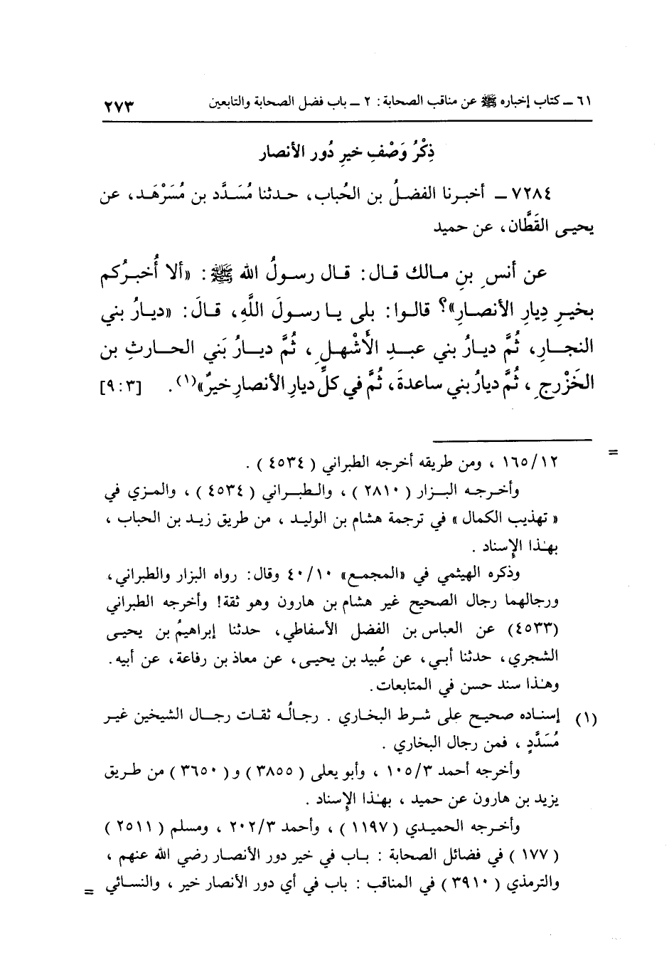7284- أَخْبَرَنَا الْفَضْلُ بْنُ الْحُبَابِ حَدَّثَنَا مُسَدَّدُ بْنُ مُسَرْهَدٍ، عَنْ يَحْيَى الْقَطَّانِ عَنْ حُمَيْدٍ عَنْ أَنَسِ بْنِ مَالِكٍ قَالَ: قَالَ رَسُولُ اللَّهِ صَلَّى اللَّهُ عَلَيْهِ وَسَلَّمَ: "أَلَا أُخْبِرُكُمْ بِخَيْرِ دِيَارِ الْأَنْصَارِ"؟ قَالُوا: بَلَى يَا رَسُولَ اللَّهِ, قَالَ: "دِيَارُ بَنِي النَّجَّارِ ثُمَّ دِيَارُ بَنِي عَبْدِ الْأَشْهَلِ ثُمَّ دِيَارُ بَنِي الْحَارِثِ بْنِ الْخَزْرَجِ ثُمَّ دِيَارُ بَنِي سَاعِدَةَ ثُمَّ فِي كُلِّ دِيَارِ الأنصار خير" 1. [3: 9]