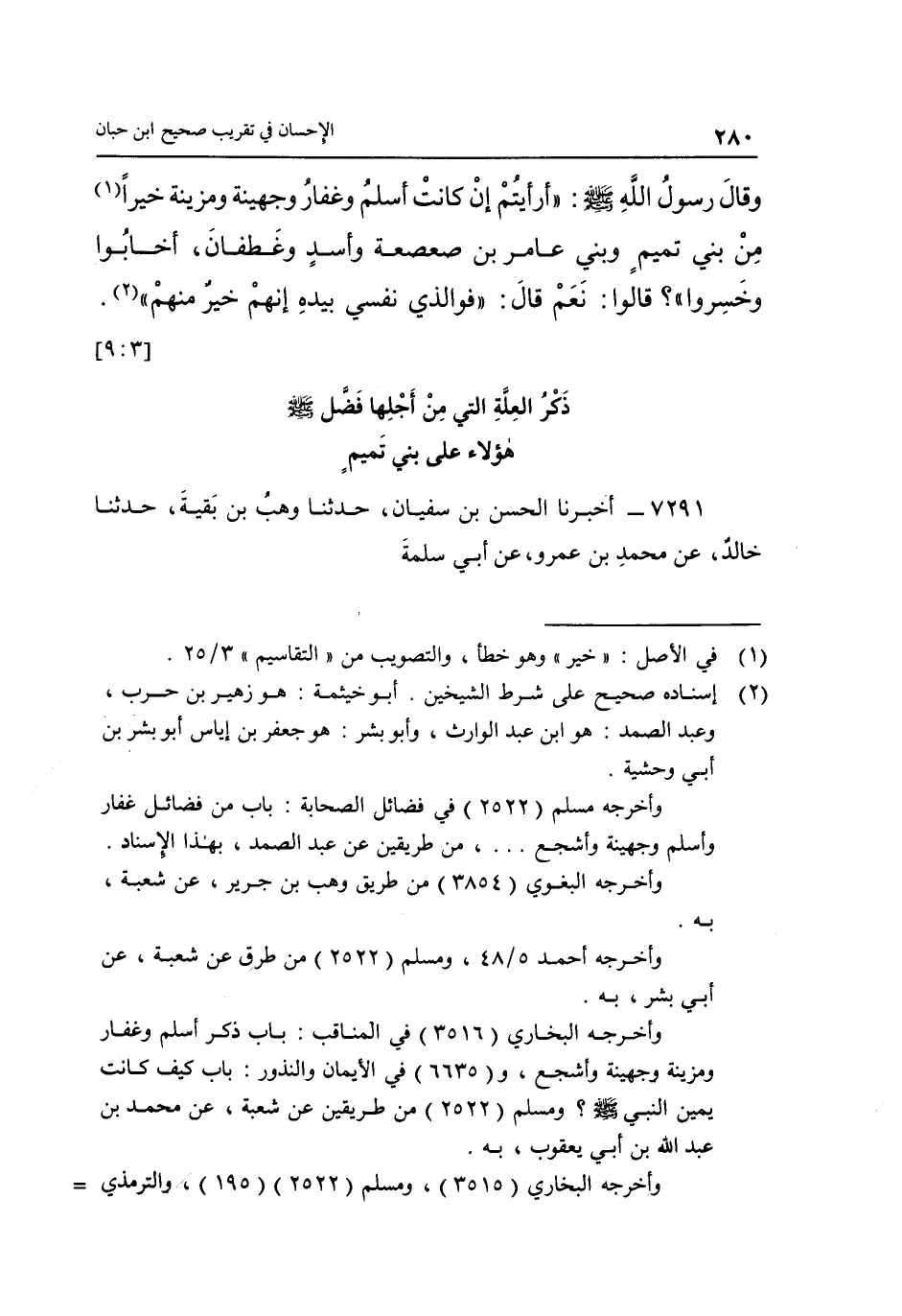 وَقَالَ رَسُولُ اللَّهِ صَلَّى اللَّهُ عَلَيْهِ وَسَلَّمَ: "أَرَأَيْتُمْ إِنْ كَانَتْ أَسْلَمُ وَغِفَارُ وَجُهَيْنَةُ وَمُزَيْنَةُ خَيْرًا1 مِنْ بَنِي تَمِيمٍ وَبَنِي عَامِرِ بْنِ صَعْصَعَةَ وَأَسَدٍ وَغَطَفَانَ أَخَابُوا وَخَسِرُوا"؟ قَالُوا: نَعَمْ, قَالَ: "فَوَالَّذِي نَفْسِي بِيَدِهِ إِنَّهُمْ خَيْرٌ مِنْهُمْ" 2. [3: 9]