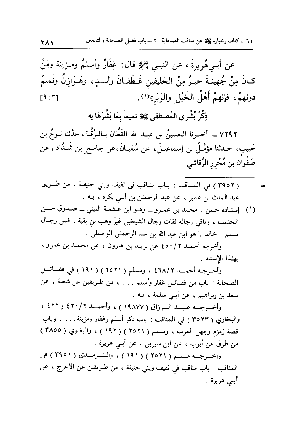 عَنْ أَبِي هُرَيْرَةَ عَنِ النَّبِيِّ صَلَّى اللَّهُ عَلَيْهِ وَسَلَّمَ قَالَ: "غِفَارُ وَأَسْلَمُ وَمُزَيْنَةُ وَمَنْ كَانَ مِنْ جُهَيْنَةَ خَيْرٌ مِنَ الْحَلِيفَيْنِ غَطَفَانَ وَأَسَدٍ وَهَوَازِنُ وَتَمِيمٌ دُونَهُمْ فَإِنَّهُمْ أَهْلُ الْخَيْلِ والوبر" 1. [3: 9]