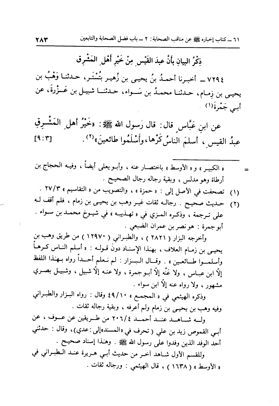 7294- أَخْبَرَنَا أَحْمَدُ بْنُ يَحْيَى بْنِ زُهَيْرٍ بِتُسْتُرَ حَدَّثَنَا وَهْبُ بْنُ يَحْيَى بْنِ زِمَامٍ حَدَّثَنَا مُحَمَّدُ بْنُ سَوَاءٍ حَدَّثَنَا شُبَيْلُ بْنُ عَزْرَةَ عَنْ أَبِي جَمْرَةَ1 عَنِ ابْنِ عَبَّاسٍ قَالَ: قَالَ رَسُولُ اللَّهِ صَلَّى اللَّهُ عَلَيْهِ وَسَلَّمَ: "خَيْرُ أَهْلِ الْمَشْرِقِ عَبْدُ الْقَيْسِ، أسلم الناس كرها وأسلموا طائعين" 2. [3: 9]