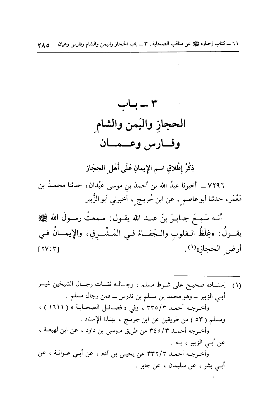 7296- أَخْبَرَنَا عَبْدُ اللَّهِ بْنُ أَحْمَدَ بْنِ مُوسَى عَبْدَانُ حَدَّثَنَا مُحَمَّدُ بْنُ مَعْمَرٍ حَدَّثَنَا أَبُو عَاصِمٍ عَنِ ابْنِ جُرَيْجٍ أَخْبَرَنِي أَبُو الزُّبَيْرِ أَنَّهُ سَمِعَ جَابِرَ بْنَ عَبْدِ اللَّهِ يَقُولُ: سَمِعْتُ رَسُولَ اللَّهِ صَلَّى اللَّهُ عَلَيْهِ وَسَلَّمَ يقول: "غِلَظُ الْقُلُوبِ وَالْجَفَاءُ فِي الْمَشْرِقِ وَالْإِيمَانُ فِي أرض الحجاز" 1. [3: 27]
