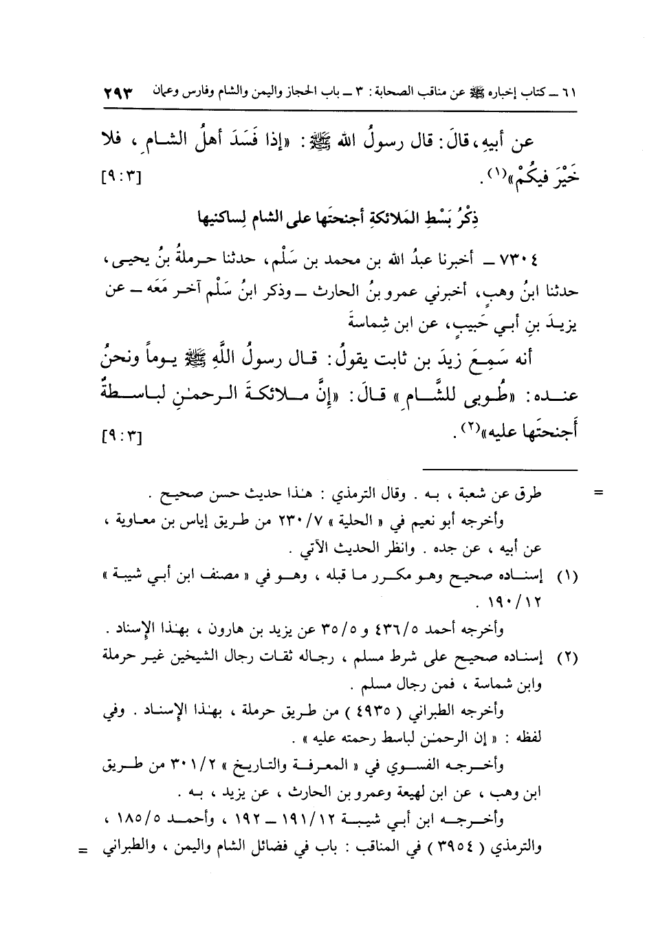7304- أَخْبَرَنَا عَبْدُ اللَّهِ بْنُ مُحَمَّدِ بْنِ سَلْمٍ حَدَّثَنَا حَرْمَلَةُ بْنُ يَحْيَى حَدَّثَنَا ابْنُ وَهْبٍ أخبرني عمرو بن الحارث - وذكر بن سَلْمٍ آخَرَ مَعَهُ - عَنْ يَزِيدَ بْنِ أَبِي حَبِيبٍ عَنِ ابْنِ شِمَاسَةَ أَنَّهُ سَمِعَ زَيْدَ بْنَ ثَابِتٍ يَقُولُ: قَالَ رَسُولُ اللَّهِ صَلَّى اللَّهُ عَلَيْهِ وَسَلَّمَ يَوْمًا وَنَحْنُ عِنْدَهُ: "طُوبَى لِلشَّامِ", قَالَ: "إِنَّ مَلَائِكَةَ الرَّحْمَنِ لَبَاسِطَةٌ أَجْنِحَتَهَا عليه" 1. [3: 9]