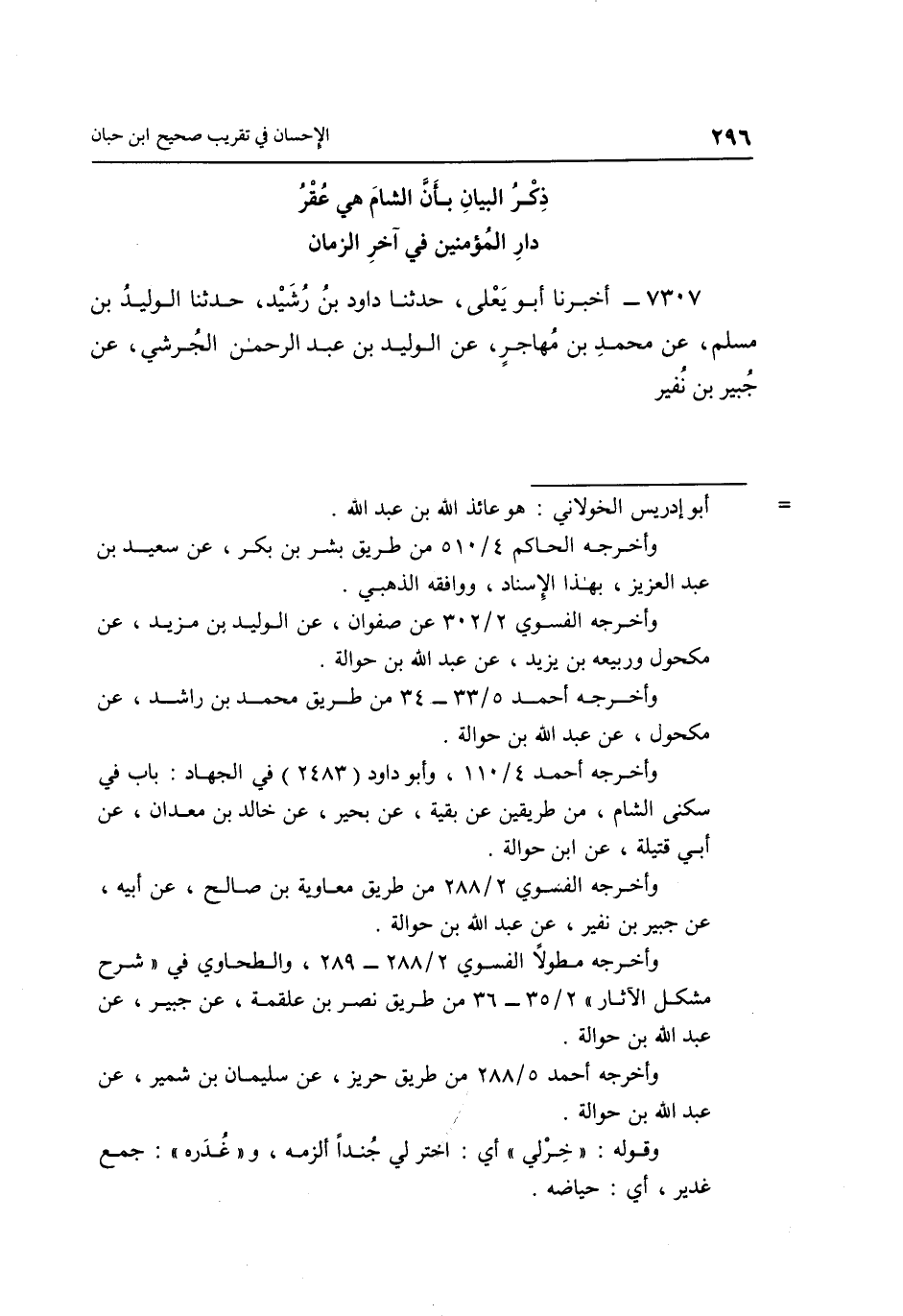 7307- أَخْبَرَنَا أَبُو يَعْلَى حَدَّثَنَا دَاوُدُ بْنُ رُشَيْدٍ حَدَّثَنَا الْوَلِيدُ بْنُ مُسْلِمٍ عَنْ مُحَمَّدِ بْنِ مُهَاجِرٍ عَنِ الْوَلِيدِ بْنِ عَبْدِ الرَّحْمَنِ الْجُرَشِيِّ عَنْ جُبَيْرِ بْنِ نفير