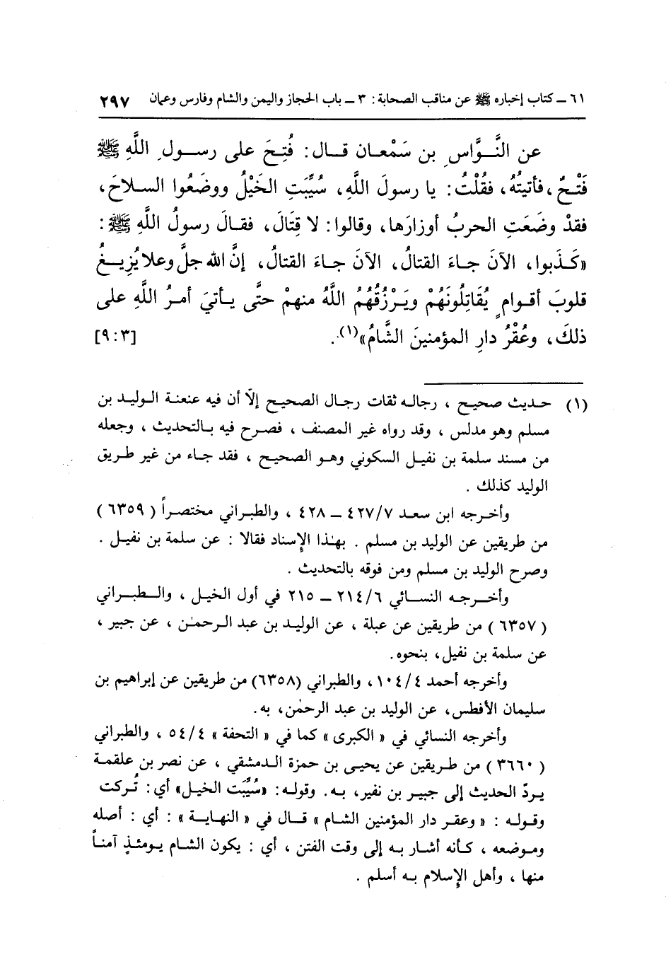 عَنِ النَّوَّاسِ بْنِ سَمْعَانَ قَالَ: فُتِحَ عَلَى رَسُولِ اللَّهِ صَلَّى اللَّهُ عَلَيْهِ وَسَلَّمَ فَتْحٌ فَأَتَيْتُهُ فَقُلْتُ: يَا رَسُولَ اللَّهِ سُيِّبَتِ الْخَيْلُ وَوَضَعُوا السِّلَاحَ فَقَدْ وَضَعَتِ الْحَرْبُ أَوْزَارَهَا وَقَالُوا: لَا قِتَالَ, فَقَالَ رَسُولُ اللَّهِ صَلَّى اللَّهُ عَلَيْهِ وَسَلَّمَ: "كَذَبُوا الْآنَ جَاءَ الْقِتَالُ الْآنَ جَاءَ الْقِتَالُ إِنَّ اللَّهَ جَلَّ وَعَلَا يُزِيغُ قُلُوبَ أَقْوَامٍ يُقَاتِلُونَهُمْ وَيَرْزُقُهُمُ اللَّهُ مِنْهُمْ حَتَّى يَأْتِيَ أَمْرُ اللَّهِ عَلَى ذَلِكَ وَعُقْرُ دَارِ المؤمنين الشام" 1. [3: 9]