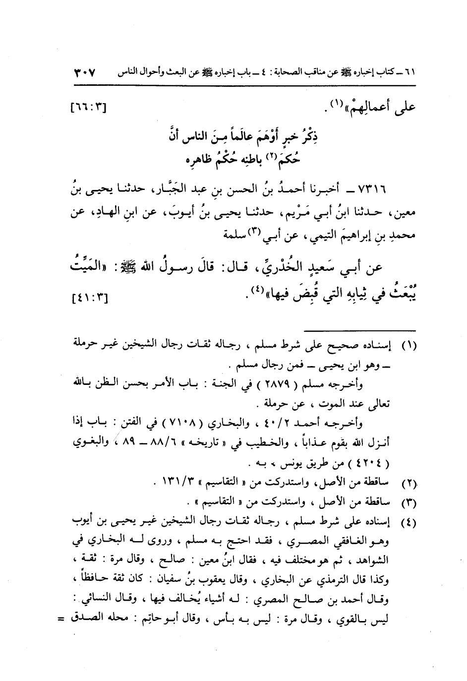 7316- أَخْبَرَنَا أَحْمَدُ بْنُ الْحَسَنِ بْنِ عَبْدِ الْجَبَّارِ حَدَّثَنَا يَحْيَى بْنُ مَعِينٍ حَدَّثَنَا ابْنُ أَبِي مَرْيَمَ حَدَّثَنَا يَحْيَى بْنُ أَيُّوبَ عَنِ ابْنِ الْهَادِ عَنْ مُحَمَّدِ بْنِ إِبْرَاهِيمَ التَّيْمِيِّ عَنْ أَبِي 2 سَلَمَةَ عَنْ أَبِي سَعِيدٍ الْخُدْرِيِّ قَالَ: قَالَ رَسُولُ اللَّهِ صَلَّى اللَّهُ عَلَيْهِ وَسَلَّمَ: "الْمَيِّتُ يُبْعَثُ فِي ثيابه التي قبض فيها" 3. [3: 41]