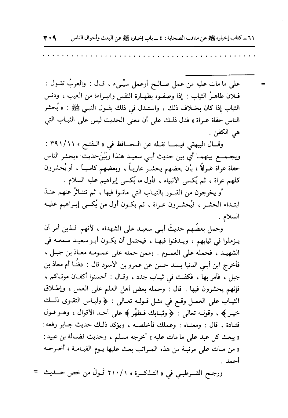 وحمل بعضهم حديث أبي سعيد على الشهداء، لأنهم الذين أمر أن يلزموا في ثيابهم، ويدفنوا فيها، فيحتمل أن يكون أبو سعيد سمعه في الشهيد، فحمله على العموم. وممن حمله على عمومه معاذ بن جبل، فأخرج ابن أبي الدنيا بسند حسن عن عمرو بن الأسود قال: دفنا أم معاذ بن جبل، فأمر بها، فكفنت في ثياب جدد، وقال: احسنوا أكفإن موتاكم، فغنهم يحشرون فيها. قال: وحمله بعض أهل العلم على العمل، وإطلاق الثياب على العمل وقع في مثل قوله تعالى: {وَلِبَاسُ التَّقْوَى ذَلِكَ خَيْرٌ} ، وقوله تعالى: {وَثِيَابَكَ فَطَهِّرْ} على أحد الأقوال، وهو قول قتادة، قال: ومعناه: وعملك فأخلصه، وؤكد ذلك حديث جابر رفعه: "يبعث كل عبد على ما مات عليه" اخرجه مسلم، وحديث فضالة بن عبيد: "من مات على مرتبة من هذه المراتب بعث عليها يوم القيامة" أخرجه احمد.