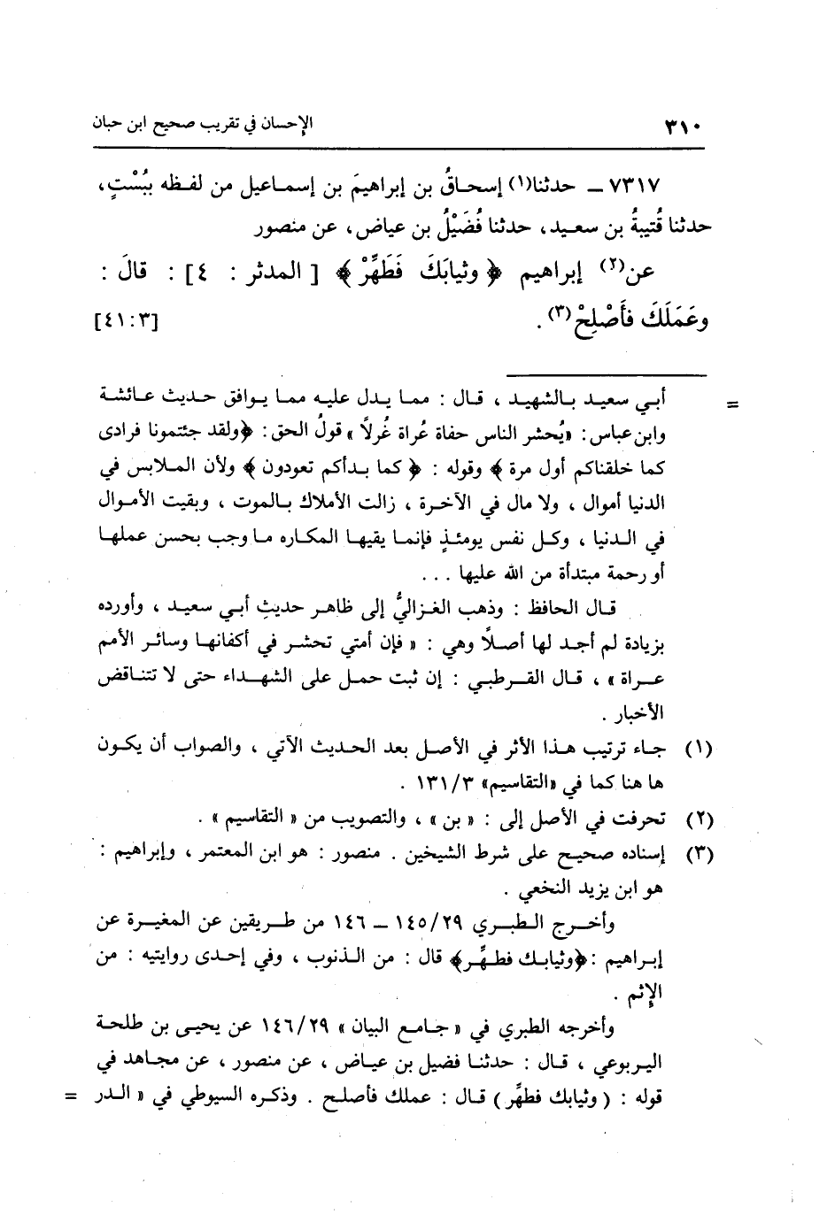 7317- حَدَّثَنَا1 إِسْحَاقُ بْنُ إِبْرَاهِيمَ بْنِ إِسْمَاعِيلَ مِنْ لَفْظِهِ بِبُسْتٍ حَدَّثَنَا قُتَيْبَةُ بْنُ سَعِيدٍ حَدَّثَنَا فُضَيْلُ بْنُ عِيَاضٍ عَنْ مَنْصُورٍ عَنْ2 إِبْرَاهِيمَ {وَثِيَابَكَ فَطَهِّرْ} [المدثر: 4] قال: وعملك فأصلح3. [3: 41]