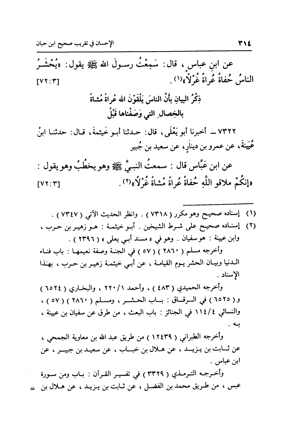 7322- أَخْبَرَنَا أَبُو يَعْلَى قَالَ حَدَّثَنَا أَبُو خَيْثَمَةَ قَالَ حَدَّثَنَا ابْنُ عُيَيْنَةَ عَنْ عَمْرِو بْنِ دِينَارٍ عَنْ سَعِيدِ بْنِ جُبَيْرٍ عَنِ ابْنِ عَبَّاسٍ قَالَ: سَمِعْتُ النَّبِيَّ صَلَّى اللَّهُ عَلَيْهِ وَسَلَّمَ وَهُوَ يَخْطُبُ وَهُوَ يَقُولُ: "إِنَّكُمْ مُلَاقُو اللَّهِ حُفَاةً عراة مشاة غرلا" 1. [3: 72]