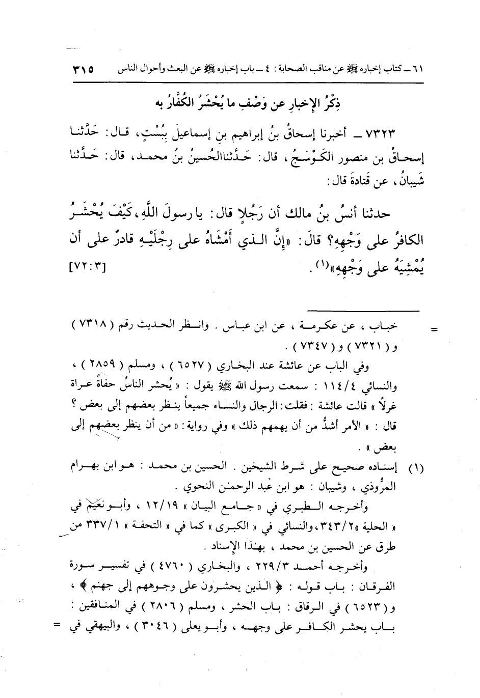 7323- أَخْبَرَنَا إِسْحَاقُ بْنُ إِبْرَاهِيمَ بْنِ إِسْمَاعِيلَ بِبُسْتَ قَالَ: حَدَّثَنَا إِسْحَاقُ بْنُ مَنْصُورٍ الْكَوْسَجُ قَالَ: حَدَّثَنَا الْحُسَيْنُ بْنُ مُحَمَّدٍ قَالَ: حَدَّثَنَا شَيْبَانُ عَنْ قَتَادَةَ قَالَ: حَدَّثَنَا أَنَسِ بْنِ مَالِكٍ أَنَّ رَجُلًا قَالَ: يَا رَسُولَ اللَّهِ كَيْفَ يُحْشَرُ الْكَافِرُ عَلَى وَجْهِهِ؟ قَالَ: "إِنَّ الَّذِيَ أَمْشَاهُ عَلَى رِجْلَيْهِ قَادِرٌ عَلَى أَنْ يمشيه على وجهه" 1. [3: 72]
