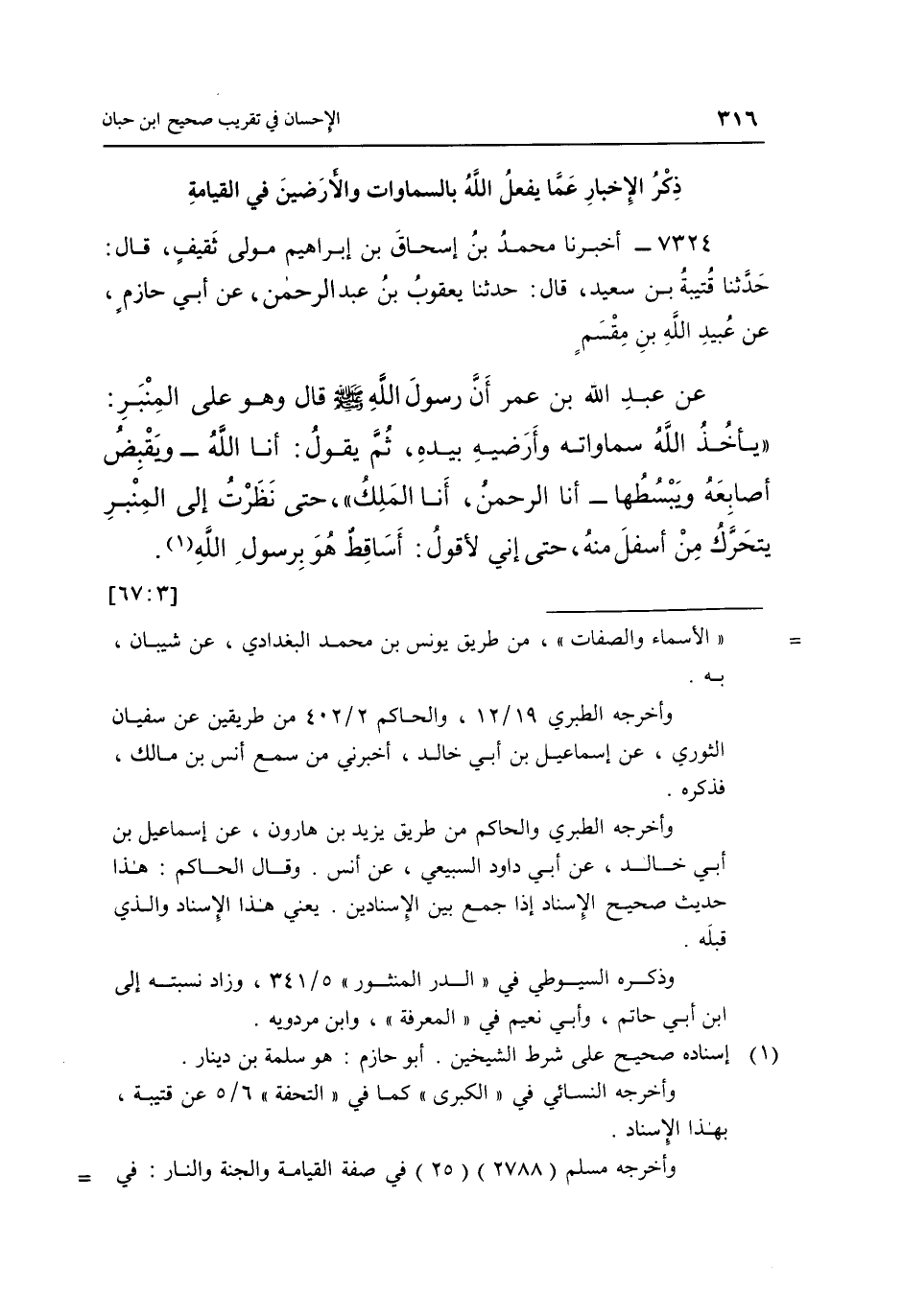 7324- أَخْبَرَنَا مُحَمَّدُ بْنُ إِسْحَاقَ بْنِ إِبْرَاهِيمَ مَوْلَى ثَقِيفٍ قَالَ حَدَّثَنَا قُتَيْبَةُ بْنُ سَعِيدٍ قَالَ حَدَّثَنَا يَعْقُوبُ بْنُ عَبْدِ الرَّحْمَنِ عَنْ أَبِي حَازِمٍ عَنْ عُبَيْدِ اللَّهِ بْنِ مِقْسَمٍ عَنْ عَبْدِ اللَّهِ بْنِ عُمَرَ أَنَّ رَسُولَ اللَّهِ صَلَّى اللَّهُ عَلَيْهِ وسلم قال وَهُوَ عَلَى الْمِنْبَرِ: "يَأْخُذُ اللَّهُ سَمَاوَاتِهِ وَأَرَضِيهِ بِيَدِهِ ثُمَّ يَقُولُ: أَنَا اللَّهُ - وَيَقْبِضُ أَصَابِعَهُ وَيَبْسُطُهَا- أَنَا الرَّحْمَنُ أَنَا الْمَلِكُ"، حَتَّى نَظَرْتُ إِلَى الْمِنْبَرِ يَتَحَرَّكُ مِنْ أَسْفَلِ مِنْهُ حَتَّى أني لأقول: أساقطٌ هو برسول الله 1. [3: 67]