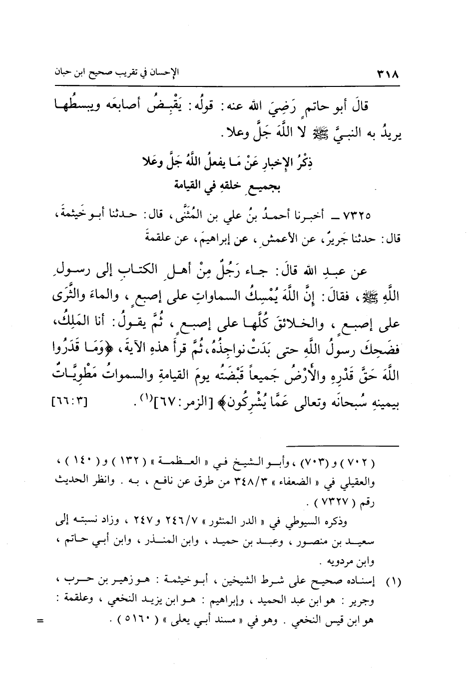 7325- أَخْبَرَنَا أَحْمَدُ بْنُ عَلِيِّ بْنِ الْمُثَنَّى قَالَ حَدَّثَنَا أَبُو خَيْثَمَةَ قَالَ حَدَّثَنَا جَرِيرٌ عَنْ الْأَعْمَشِ عَنْ إِبْرَاهِيمَ عَنْ عَلْقَمَةَ عَنْ عَبْدِ اللَّهِ قَالَ: جَاءَ رَجُلٌ مِنْ أَهْلِ الْكِتَابِ إِلَى رَسُولِ اللَّهِ صَلَّى اللَّهُ عَلَيْهِ وَسَلَّمَ فقال: إن اللَّهَ يُمْسِكُ السَّمَاوَاتِ عَلَى إِصْبَعٍ وَالْمَاءَ وَالثَّرَى عَلَى إِصْبَعٍ وَالْخَلَائِقَ كُلَّهَا عَلَى إِصْبَعٍ ثُمَّ يَقُولُ: أَنَا الْمَلِكُ, فَضَحِكَ رَسُولُ اللَّهِ حَتَّى بَدَتْ نَوَاجِذُهُ ثُمَّ قَرَأَ هَذِهِ الْآيَةَ: {وَمَا قَدَرُوا اللَّهَ حَقَّ قَدْرِهِ وَالْأَرْضُ جَمِيعاً قَبْضَتُهُ يَوْمَ الْقِيَامَةِ وَالسَّمَاوَاتُ مَطْوِيَّاتٌ بِيَمِينِهِ سُبْحَانَهُ وَتَعَالَى عَمَّا يُشْرِكُونَ} [الزمر:67] 1. [3: 66]