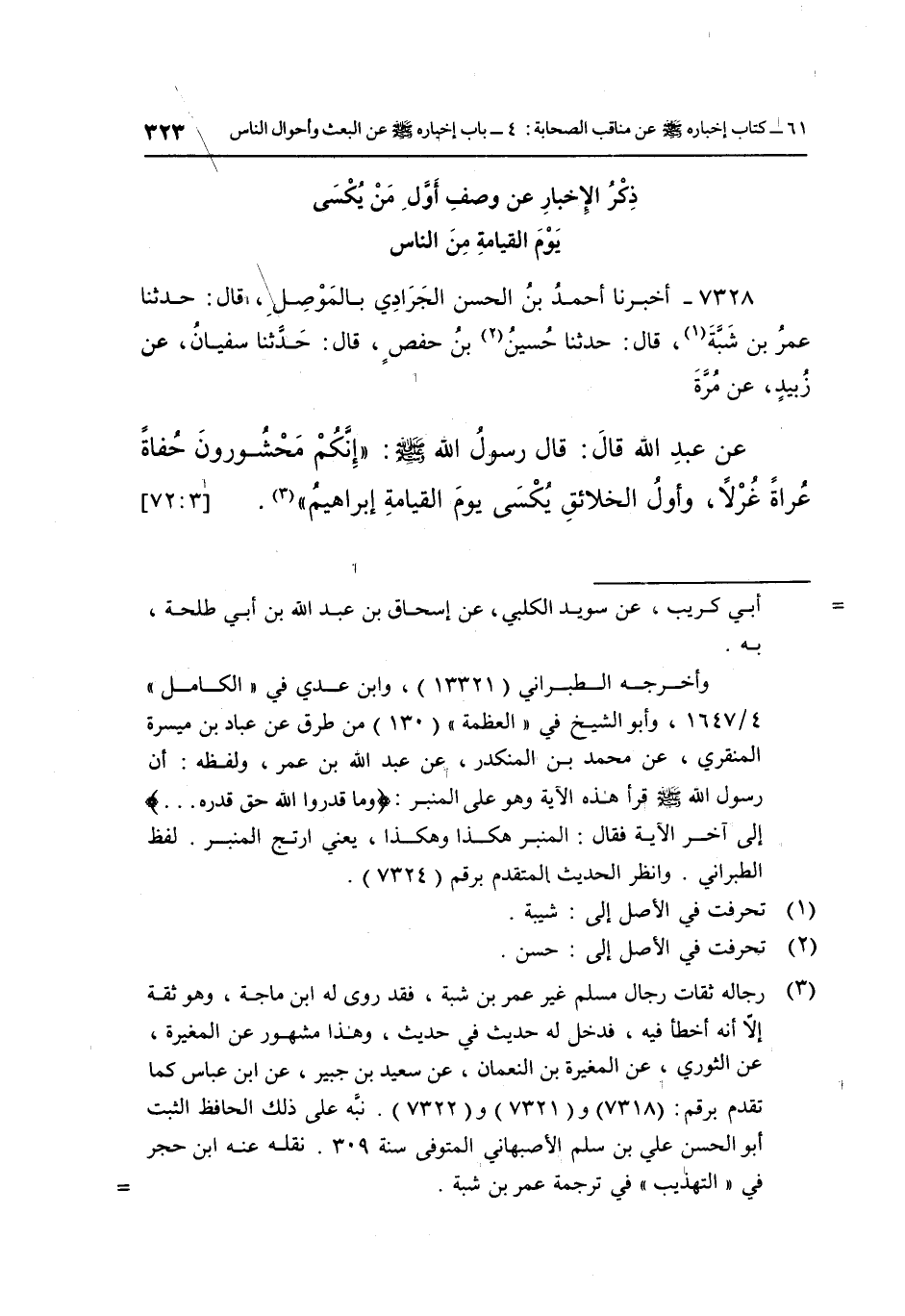 7328- أَخْبَرَنَا أَحْمَدُ بْنُ الْحَسَنِ الْجَرَادِيُّ بِالْمَوْصِلِ قَالَ: حَدَّثَنَا عُمَرُ بْنُ شَبَّةَ1 قَالَ: حَدَّثَنَا حُسَيْنُ2 بْنُ حَفْصٍ قَالَ: حَدَّثَنَا سُفْيَانُ عَنْ زُبَيْدٍ عَنْ مُرَّةَ عَنْ عَبْدِ اللَّهِ قَالَ: قَالَ رَسُولُ اللَّهِ صَلَّى اللَّهُ عَلَيْهِ وَسَلَّمَ: "إِنَّكُمْ مَحْشُورُونَ حُفَاةً عُرَاةً غُرْلًا وَأَوَّلُ الْخَلَائِقِ يُكْسَى يَوْمَ الْقِيَامَةِ إِبْرَاهِيمُ" 3. [3: 72]