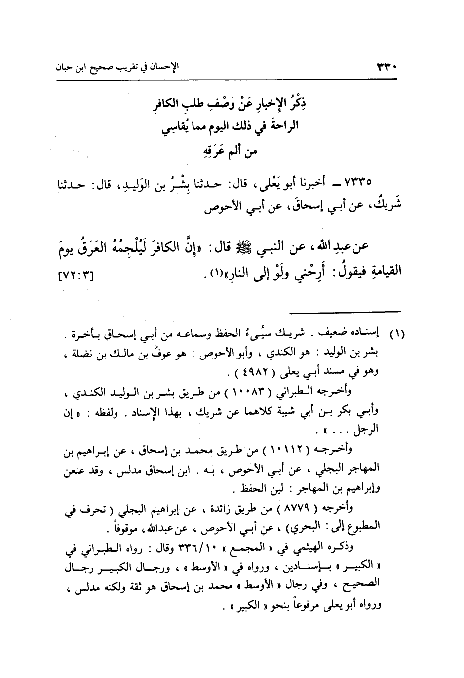 7335- أَخْبَرَنَا أَبُو يَعْلَى قَالَ: حَدَّثَنَا بِشْرُ بْنُ الْوَلِيدِ قَالَ: حَدَّثَنَا شَرِيكٌ عَنْ أَبِي إِسْحَاقَ عَنْ أَبِي الْأَحْوَصِ عَنْ عَبْدِ اللَّهِ عَنِ النَّبِيِّ صَلَّى اللَّهُ عَلَيْهِ وَسَلَّمَ قَالَ: "إِنَّ الْكَافِرَ لَيُلْجِمُهُ الْعَرَقُ يَوْمَ الْقِيَامَةِ فَيَقُولُ أرحني ولو إلى النار" 1. [3: 72]