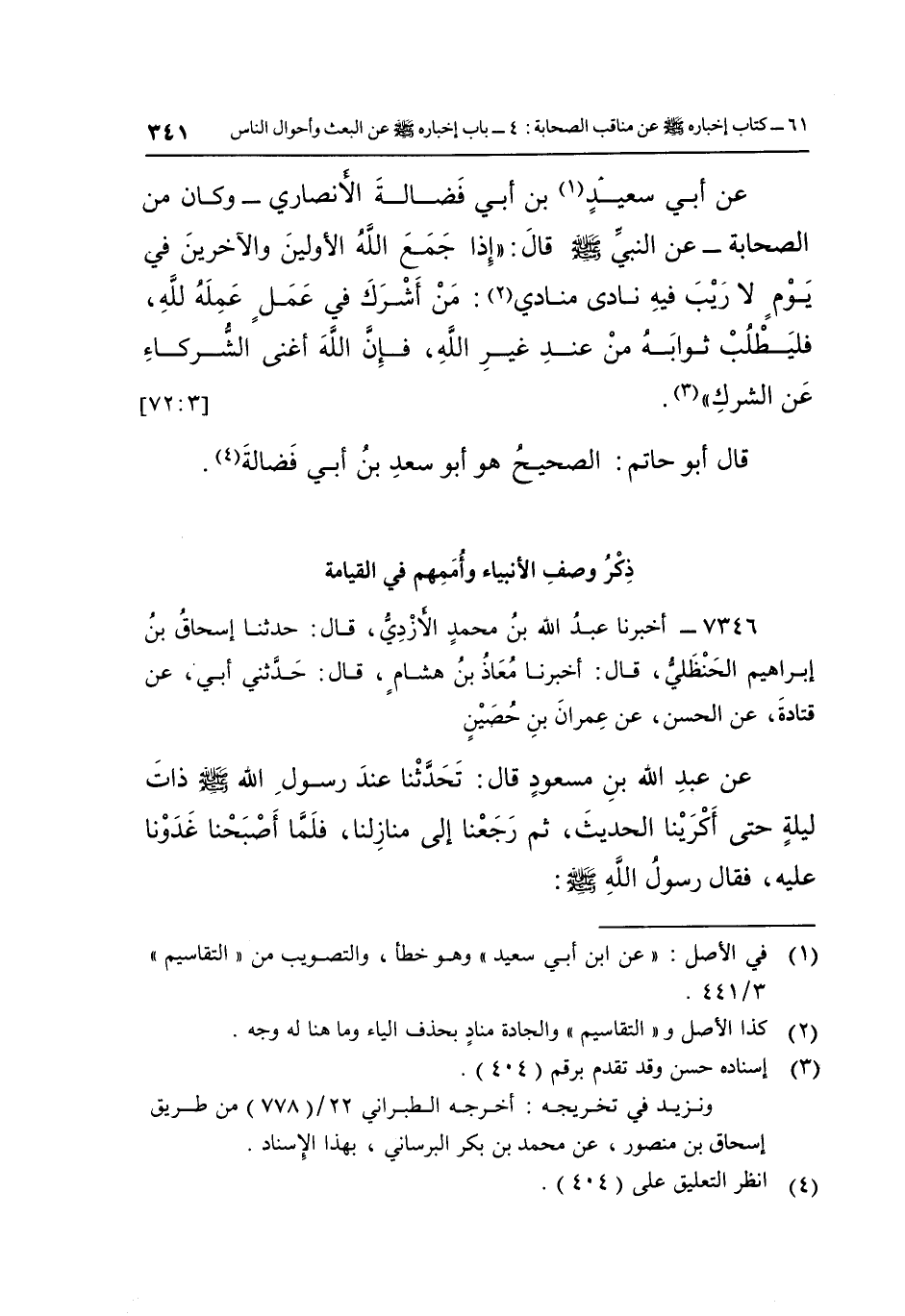 عَنْ أَبِي سَعِيدِ1 بْنِ أَبِي فَضَالَةَ الْأَنْصَارِيِّ وَكَانَ مِنَ الصَّحَابَةِ عَنِ النَّبِيِّ صَلَّى اللَّهُ عَلَيْهِ وَسَلَّمَ قَالَ: "إِذَا جَمَعَ اللَّهُ الْأَوَّلِينَ وَالْآخِرِينَ فِي يَوْمٍ لَا رَيْبَ فِيهِ نَادَى مُنَادِي 2 مَنْ أَشْرَكَ فِي عَمَلٍ عَمِلَهُ لِلَّهِ فَلْيَطْلُبْ ثَوَابَهُ مِنَ عِنْدِ غَيْرِ اللَّهِ فَإِنَّ اللَّهَ أَغْنَى الشُّرَكَاءِ عَنِ الشِّرْكِ" 3. [3: 72]
