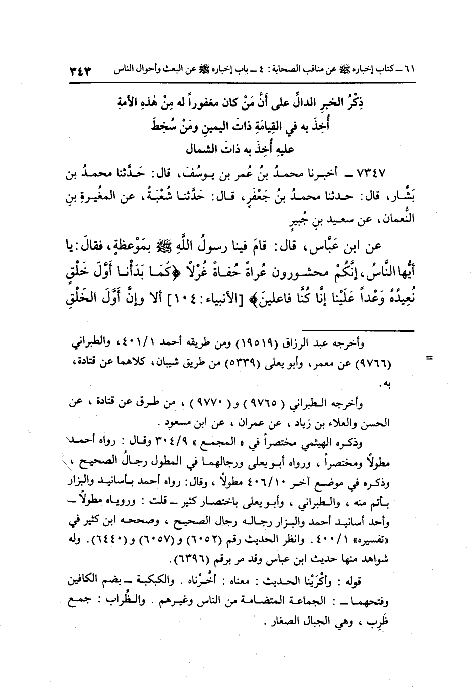 7347- أَخْبَرَنَا مُحَمَّدُ بْنُ عُمَرَ بْنِ يُوسُفَ قَالَ: حَدَّثَنَا مُحَمَّدُ بْنُ بَشَّارٍ قَالَ: حَدَّثَنَا مُحَمَّدُ بْنُ جَعْفَرٍ قَالَ: حَدَّثَنَا شُعْبَةُ عَنْ الْمُغِيرَةِ بْنِ النُّعْمَانِ عَنْ سَعِيدِ بْنِ جُبَيْرٍ عَنِ ابْنِ عَبَّاسٍ قَالَ: قَامَ فِينَا رَسُولُ اللَّهِ صَلَّى اللَّهُ عَلَيْهِ وَسَلَّمَ بِمَوْعِظَةٍ فَقَالَ: "يَا أَيُّهَا النَّاسُ إِنَّكُمْ مَحْشُورُونَ عُرَاةً حُفَاةً غُرْلًا {كَمَا بَدَأْنَا أَوَّلَ خَلْقٍ نُعِيدُهُ وَعْداً عَلَيْنَا إِنَّا كُنَّا فَاعِلِينَ} [الأنبياء: 104] أَلَا وَإِنَّ أَوَّلَ الْخَلْقِ