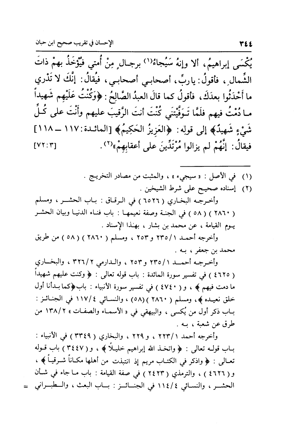 يُكْسَى إِبْرَاهِيمُ أَلَا وَإِنَّهُ 1 سَيُجَاءُ بِرِجَالٍ مِنْ أُمَّتِي فَيُؤْخَذُ بِهِمْ ذَاتَ الشِّمَالِ فَأَقُولُ: يَا رَبِّ أَصْحَابِي أَصْحَابِي, فَيُقَالُ: إِنَّكَ لَا تَدْرِي مَا أَحْدَثُوا بَعْدَكَ فَأَقُولُ كَمَا قَالَ الْعَبْدُ الصَّالِحُ: {وَكُنْتُ عَلَيْهِمْ شَهِيداً مَا دُمْتُ فِيهِمْ فَلَمَّا تَوَفَّيْتَنِي كُنْتَ أَنْتَ الرَّقِيبَ عَلَيْهِمْ وَأَنْتَ عَلَى كُلِّ شَيْءٍ شَهِيدٌ} إلى قوله: {الْعَزِيزُ الْحَكِيمُ} [اللمائدة: 117 - 118] فَيُقَالُ: إِنَّهُمْ لَمْ يَزَالُوا مُرْتَدِّينَ عَلَى أَعْقَابِهِمْ" 2. [3: 72]