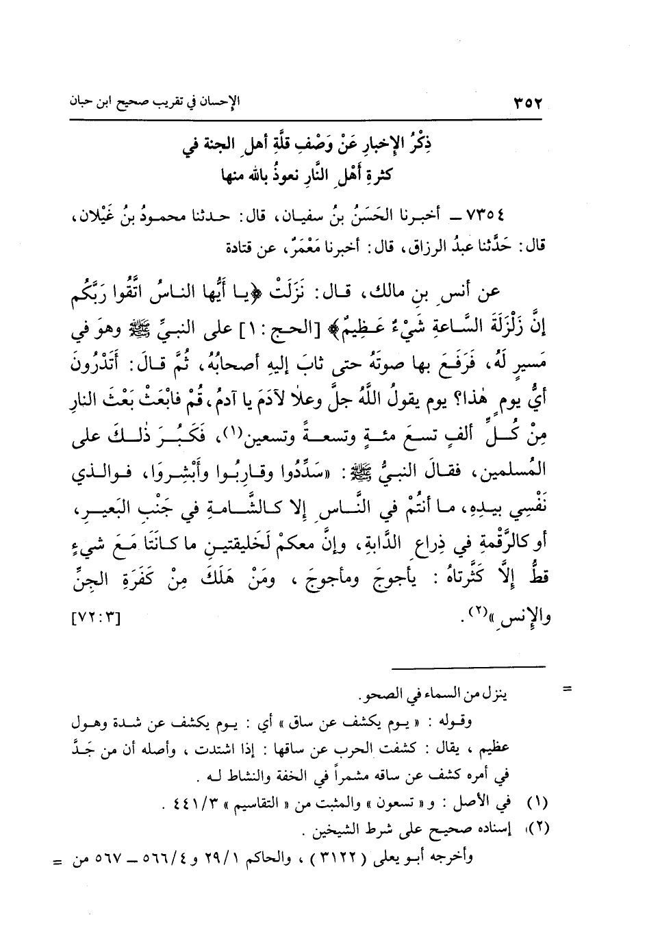 7354- أَخْبَرَنَا الْحَسَنُ بْنُ سُفْيَانَ قَالَ: حَدَّثَنَا مَحْمُودُ بْنُ غَيْلَانَ قَالَ: حَدَّثَنَا عَبْدُ الرَّزَّاقِ قَالَ: أَخْبَرَنَا مَعْمَرٌ عَنْ قَتَادَةَ عَنْ أَنَسِ بْنِ مَالِكٍ قَالَ: نَزَلَتْ {يَا أَيُّهَا النَّاسُ اتَّقُوا رَبَّكُمْ إِنَّ زَلْزَلَةَ السَّاعَةِ شَيْءٌ عَظِيمٌ} [الحج: 1] عَلَى النَّبِيِّ صَلَّى اللَّهُ عَلَيْهِ وَسَلَّمَ وَهُوَ فِي مَسِيرٍ لَهُ فَرَفَعَ بِهَا صَوْتَهُ حَتَّى ثَابَ إِلَيْهِ أَصْحَابُهُ ثُمَّ قَالَ: "أَتَدْرُونَ أَيُّ يوم هذا؟ يوم يقول الله جلا وَعَلَا لِآدَمَ يَا آدَمُ قُمْ فَابْعَثْ بَعْثَ النَّارِ مِنْ كُلِّ أَلْفٍ تِسْعَ مِائَةٍ وَتِسْعَةً وَتِسْعِينَ" 1 فَكَبُرَ ذَلِكَ عَلَى الْمُسْلِمِينَ فَقَالَ النَّبِيُّ صَلَّى اللَّهُ عَلَيْهِ وَسَلَّمَ: "سَدِّدُوا وَقَارِبُوا وَأَبْشِرُوا فَوَالَّذِي نَفْسِي بِيَدِهِ مَا أَنْتُمْ فِي النَّاسِ إِلَّا كَالشَّامَةِ فِي جَنْبِ الْبَعِيرِ أَوْ كَالرَّقْمَةِ فِي ذِرَاعِ الدَّابَّةِ وَإِنَّ مَعَكُمْ لَخَلِيقَتَيْنِ مَا كَانَتَا مَعَ شَيْءٍ قَطُّ إِلَّا كَثَّرَتَاهُ: يَأْجُوجَ ومأجوج ومن هلك من كفر الجن والإنس" 2. [3: 72]