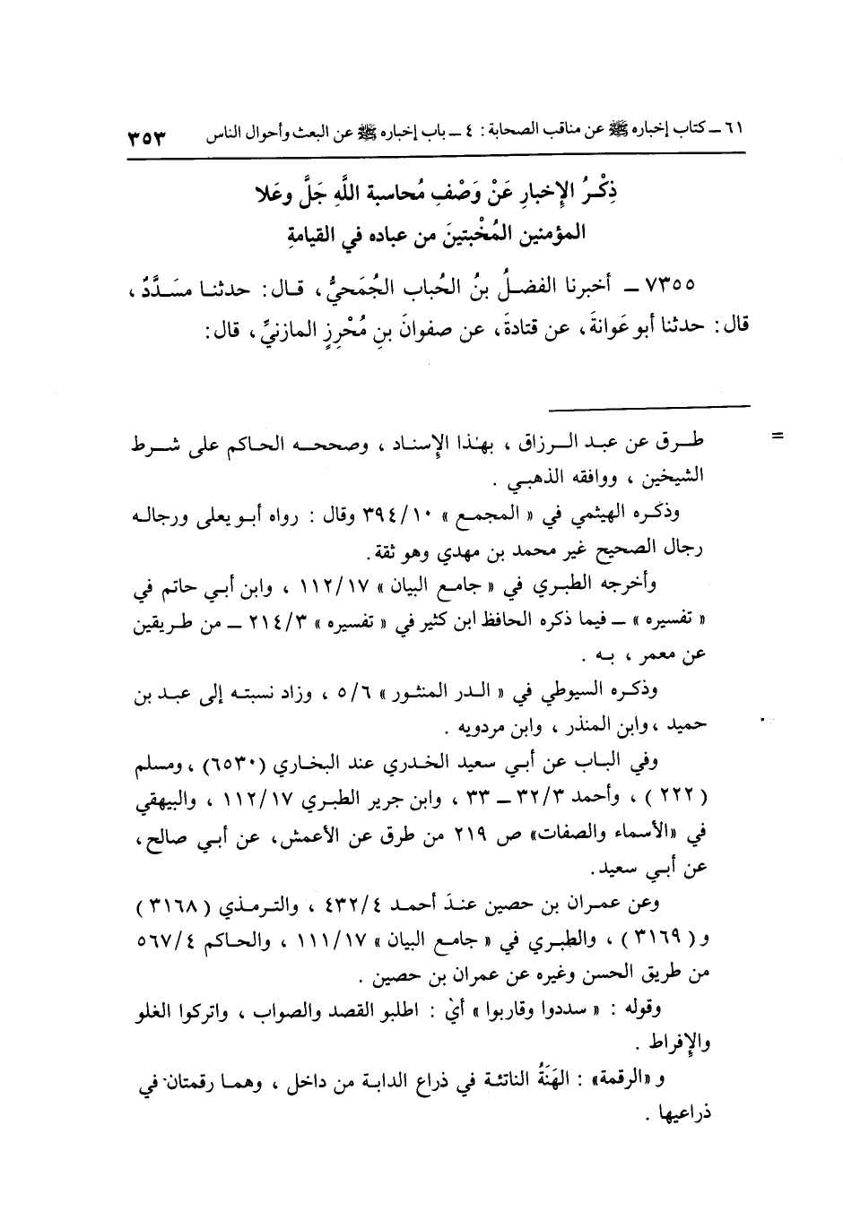 7355- أَخْبَرَنَا الْفَضْلُ بْنُ الْحُبَابِ الْجُمَحِيُّ قَالَ: حَدَّثَنَا مُسَدَّدٌ قَالَ: حَدَّثَنَا أَبُو عَوَانَةَ عَنْ قَتَادَةَ عَنْ صَفْوَانِ بْنِ مُحْرِزٍ الْمَازِنِيِّ قَالَ:
