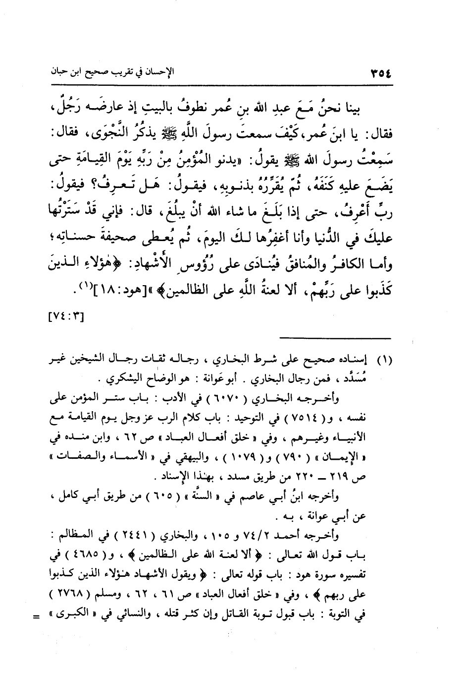 بَيْنَا نَحْنُ مَعَ عَبْدِ اللَّهِ بْنِ عُمَرَ نطوف بالبيت إذا عارضه رجل فقال: يا بن عُمَرَ كَيْفَ سَمِعْتُ رَسُولَ اللَّهِ صَلَّى اللَّهُ عَلَيْهِ وَسَلَّمَ يَذْكُرُ النَّجْوَى, فَقَالَ: سَمِعْتُ رَسُولَ اللَّهِ صَلَّى اللَّهُ عَلَيْهِ وَسَلَّمَ يَقُولُ: "يَدْنُو الْمُؤْمِنُ مِنْ رَبِّهِ يَوْمَ الْقِيَامَةِ حَتَّى يَضَعَ عَلَيْهِ كَنَفَهُ ثُمَّ يُقَرِّرُهُ بِذُنُوبِهِ فَيَقُولُ: هَلْ تَعْرِفُ؟ فَيَقُولُ: رَبِّ أَعْرِفُ حَتَّى إِذَا بَلَغَ مَا شَاءَ اللَّهُ أَنْ يَبْلُغَ, قَالَ: فَإِنِّي قَدْ سَتَرْتُهَا عَلَيْكَ فِي الدُّنْيَا وَأَنَا أَغْفِرُهَا لَكَ الْيَوْمَ, ثُمَّ يُعْطَى صَحِيفَةَ حَسَنَاتِهِ, وَأَمَّا الكافر والمنافق فينادى على رؤوس الأشهاد: {هَؤُلاءِ الَّذِينَ كَذَبُوا عَلَى رَبِّهِمْ أَلا لَعْنَةُ اللَّهِ عَلَى الظَّالِمِينَ} " [هود: 18] 1. [3: 74]