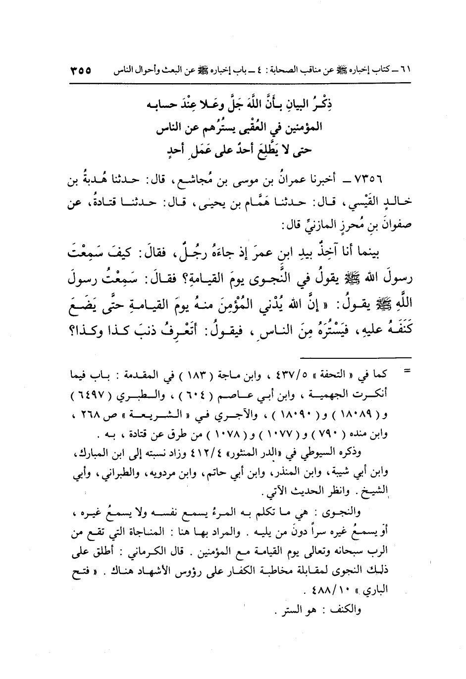 7356- أَخْبَرَنَا عِمْرَانُ بْنُ مُوسَى بْنِ مُجَاشِعٍ قَالَ: حَدَّثَنَا هُدْبَةُ بْنُ خَالِدٍ الْقَيْسِيُّ قَالَ: حَدَّثَنَا هَمَّامُ بْنُ يَحْيَى قَالَ: حَدَّثَنَا قَتَادَةُ عَنْ صَفْوَانَ بْنِ مُحْرِزٍ الْمَازِنِيِّ قَالَ: بَيْنَمَا أَنَا آخِذٌ بِيَدِ ابْنِ عُمَرَ إِذْ جَاءَهُ رَجُلٌ فَقَالَ: كَيْفَ سَمِعْتُ رَسُولَ اللَّهِ صَلَّى اللَّهُ عَلَيْهِ وَسَلَّمَ يَقُولُ فِي النَّجْوَى يَوْمَ الْقِيَامَةِ؟ فَقَالَ: سَمِعْتُ رَسُولَ اللَّهِ صَلَّى اللَّهُ عَلَيْهِ وَسَلَّمَ يَقُولُ: "إِنَّ اللَّهَ يُدْنِي الْمُؤْمِنَ مِنْهُ يَوْمَ الْقِيَامَةِ حَتَّى يَضَعَ كَنَفَهُ عَلَيْهِ فَيَسْتُرُهُ مِنَ النَّاسِ, فَيَقُولُ: أَتَعْرِفُ ذَنْبَ كَذَا وَكَذَا؟