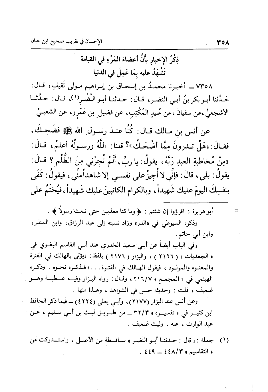 7358- أَخْبَرَنَا مُحَمَّدُ بْنُ إِسْحَاقَ بْنِ إِبْرَاهِيمَ مَوْلَى ثقيف قَالَ: حَدَّثَنَا أَبُو بَكْرِ بْنُ أَبِي النَّضْرِ1 قَالَ: حَدَّثَنَا أَبُو النَّضْرِ قَالَ: حَدَّثَنَا الْأَشْجَعِيُّ عَنْ سُفْيَانَ عَنْ عُبَيْدٍ الْمُكْتِبِ عَنْ فُضَيْلِ بْنِ عَمْرٍو عَنِ الشَّعْبِيِّ عَنْ أَنَسِ بْنِ مَالِكٍ قَالَ: كُنَّا عِنْدَ رَسُولِ اللَّهِ صَلَّى اللَّهُ عَلَيْهِ وَسَلَّمَ فَضَحِكَ فَقَالَ: "هَلْ تَدْرُونَ مِمَّا أَضْحَكُ"؟ قُلْنَا: اللَّهُ وَرَسُولُهُ أَعْلَمُ, قَالَ: "مِنْ مُخَاطَبَةِ الْعَبْدِ رَبَّهُ يَقُولُ: يَا رَبِّ أَلَمْ تُجِرْنِي مِنَ الظُّلْمِ؟ قَالَ: يَقُولُ: بَلَى, قَالَ: فَإِنِّي لَا أُجِيزُ عَلَى نَفْسِي إِلَّا شَاهِدًا مِنِّي فَيَقُولُ: كَفَى بِنَفْسِكَ الْيَوْمَ عَلَيْكَ شَهِيدًا وَبِالْكِرَامِ الْكَاتِبِينَ عَلَيْكَ شَهِيدًا فَيُخْتَمُ عَلَى