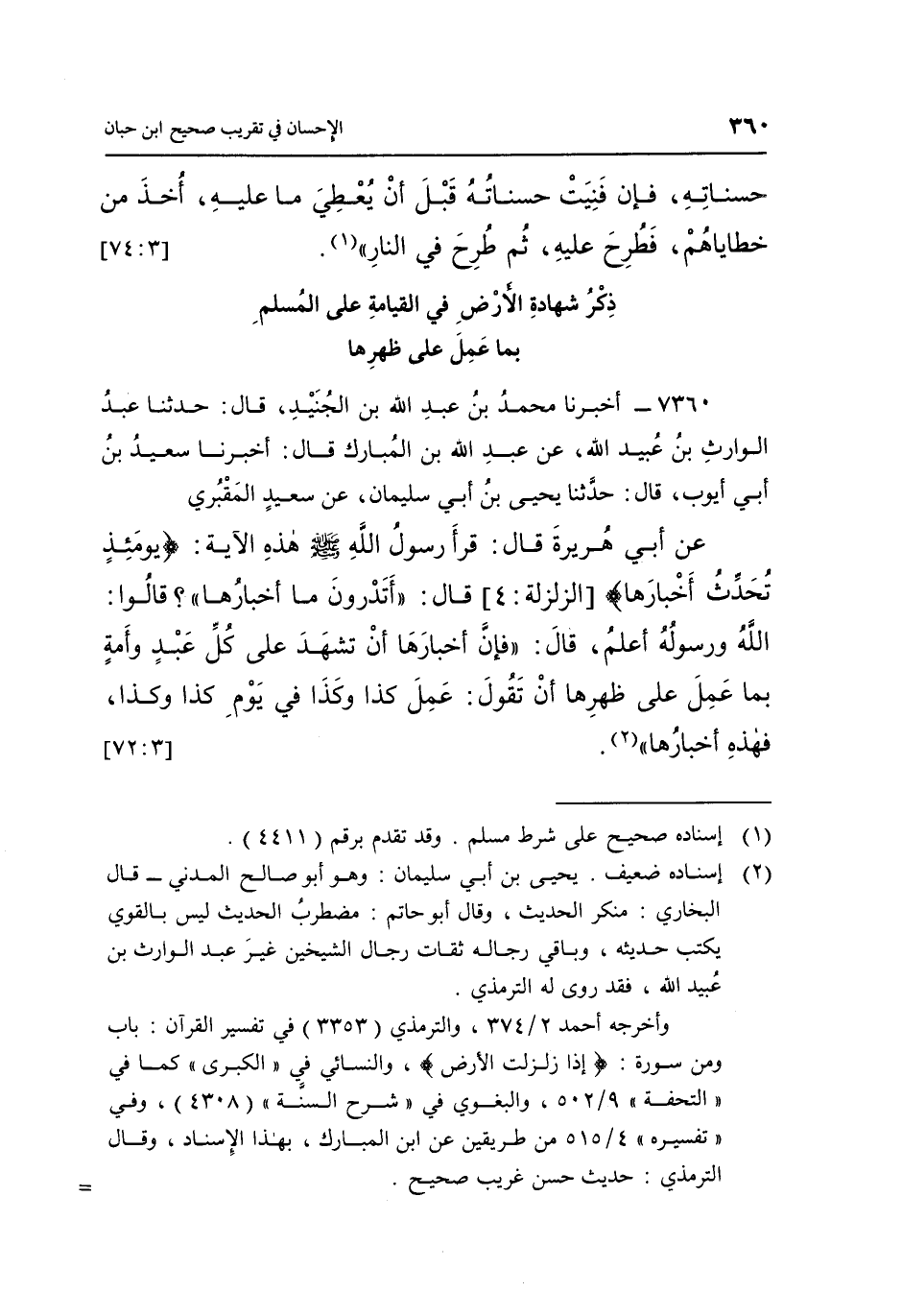 7360- أَخْبَرَنَا مُحَمَّدُ بْنُ عَبْدِ اللَّهِ بْنِ الْجُنَيْدِ قَالَ: حَدَّثَنَا عَبْدُ الْوَارِثِ بْنُ عُبَيْدِ اللَّهِ عَنْ عَبْدِ اللَّهِ بْنِ الْمُبَارَكِ قَالَ: أَخْبَرَنَا سَعِيدُ بْنُ أَبِي أَيُّوبَ قَالَ: حَدَّثَنَا يَحْيَى بْنُ أَبِي سُلَيْمَانَ عَنْ سَعِيدٍ الْمَقْبُرِيِّ عَنْ أَبِي هُرَيْرَةَ قَالَ: قَرَأَ رَسُولُ اللَّهِ صَلَّى اللَّهُ عَلَيْهِ وَسَلَّمَ هَذِهِ الْآيَةَ: {يَوْمَئِذٍ تُحَدِّثُ أَخْبَارَهَا} [الزلزلة: 4] قَالَ: "أَتَدْرُونَ مَا أَخْبَارُهَا"؟ قَالُوا: اللَّهُ وَرَسُولُهُ أَعْلَمُ قَالَ: "فَإِنَّ أَخْبَارَهَا أَنْ تَشْهَدَ عَلَى كُلِّ عَبْدٍ وَأَمَةٍ بِمَا عَمِلَ عَلَى ظَهْرِهَا أَنْ تَقُولَ: عَمِلَ كَذَا وَكَذَا فِي يَوْمِ كَذَا وكذا فهذه أخبارها" 1. [3: 72]