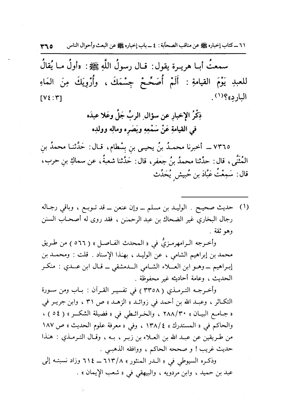 سَمِعْتُ أَبَا هُرَيْرَةَ يَقُولُ: قَالَ رَسُولُ اللَّهِ صَلَّى اللَّهُ عَلَيْهِ وَسَلَّمَ: "أَوَّلُ مَا يُقَالُ لِلْعَبْدِ يَوْمَ الْقِيَامَةِ: أَلَمْ أُصَحِّحْ جِسْمَكَ وَأَرْوِيَكَ من الماء البارد"؟ 1. [3: 74]