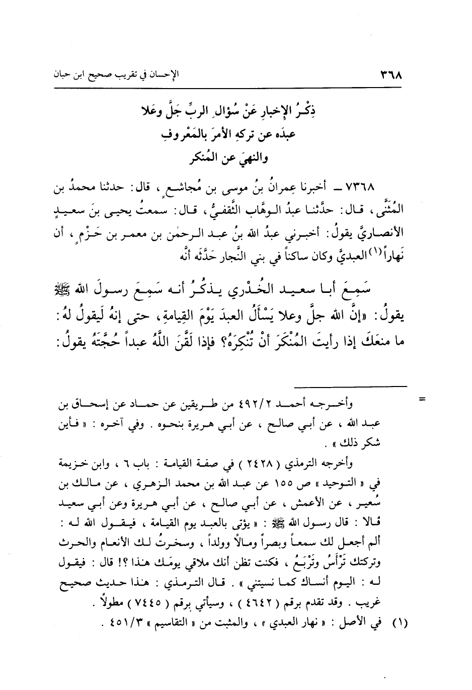 7368- أَخْبَرَنَا عِمْرَانُ بْنُ مُوسَى بْنِ مُجَاشِعٍ قَالَ: حَدَّثَنَا مُحَمَّدُ بْنُ الْمُثَنَّى قَالَ: حَدَّثَنَا عَبْدُ الْوَهَّابِ الثَّقَفِيُّ قَالَ: سَمِعْتُ يَحْيَى بْنَ سَعِيدٍ الْأَنْصَارِيَّ يَقُولُ: أَخْبَرَنِي عَبْدِ اللَّهِ بْنِ عَبْدِ الرَّحْمَنِ بْنِ مَعْمَرٍ بْنِ حَزْمٍ أَنَّ نَهَارًا1 الْعَبْدِيَّ وَكَانَ سَاكِنًا فِي بَنِي النَّجَّارِ حَدَّثَهُ: أَنَّهُ سَمِعَ أَبَا سَعِيدٍ الْخُدْرِيِّ يَذْكُرُ إِنَّهُ سَمِعَ رَسُولَ اللَّهِ صَلَّى اللَّهُ عَلَيْهِ وَسَلَّمَ يَقُولُ: "إِنَّ اللَّهَ جَلَّ وَعَلَا يَسْأَلُ الْعَبْدَ يَوْمَ الْقِيَامَةِ حَتَّى إِنَّهُ لَيَقُولُ لَهُ: مَا مَنَعَكَ إِذَا رَأَيْتَ الْمُنْكَرَ أَنْ تُنْكِرَهُ؟ فإذا لقن الله عبدا حجته يقول: