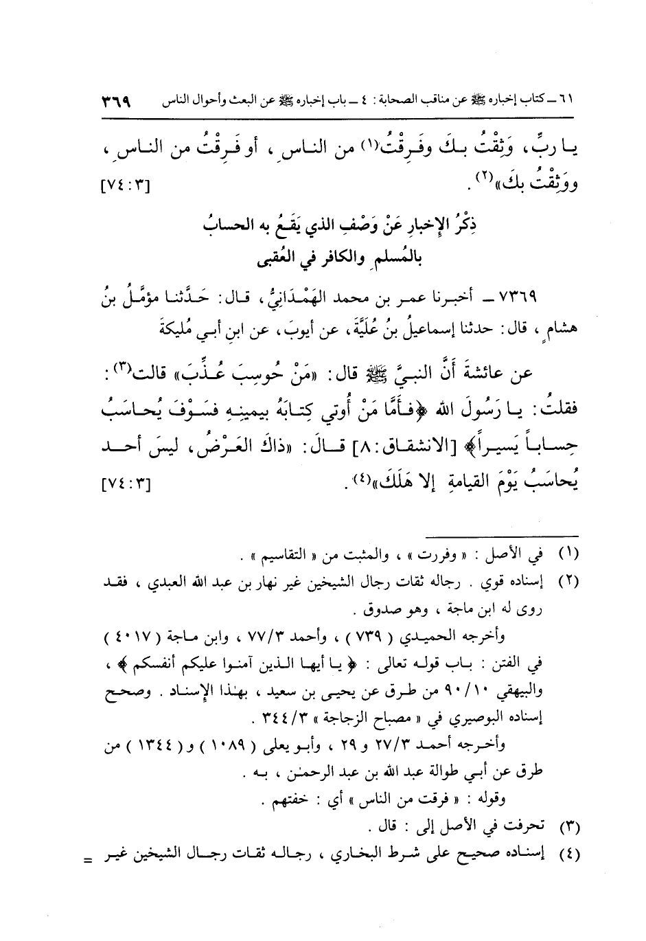 7369- أَخْبَرَنَا عُمَرُ بْنُ مُحَمَّدٍ الْهَمْدَانِيُّ قَالَ: حَدَّثَنَا مُؤَمَّلُ بْنُ هِشَامٍ قَالَ: حَدَّثَنَا إِسْمَاعِيلُ بْنُ عُلَيَّةَ عَنْ أَيُّوبَ عَنِ ابْنِ أَبِي مُلَيْكَةَ عَنْ عَائِشَةَ أَنَّ النَّبِيَّ صَلَّى اللَّهُ عَلَيْهِ وَسَلَّمَ قَالَ: "مَنْ حُوسِبَ عُذِّبَ", قَالَتْ: 1 فَقُلْتُ: يَا رَسُولَ اللَّهِ {فَأَمَّا مَنْ أُوتِيَ كِتَابَهُ بِيَمِينِهِ فَسَوْفَ يُحَاسَبُ حِسَاباً يَسِيراً} قَالَ: "ذَاكَ الْعَرْضُ لَيْسَ أَحَدٌ يُحَاسَبُ يَوْمَ القيامة إلا هلك" 2. [3: 74]