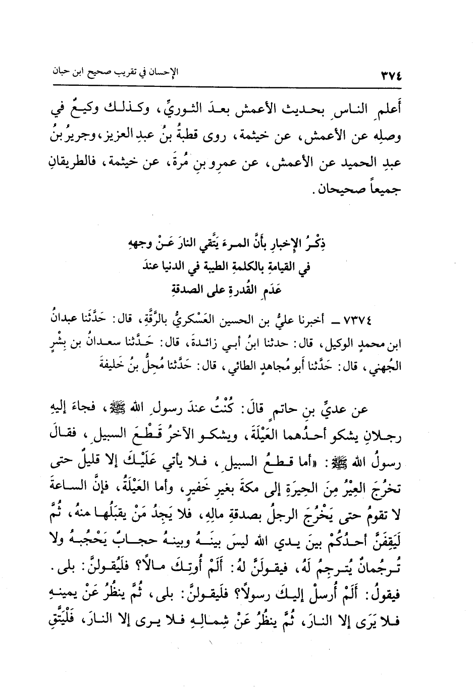 7374- أَخْبَرَنَا عَلِيُّ بْنُ الْحُسَيْنِ الْعَسْكَرِيُّ بِالرَّقَّةِ قَالَ: حَدَّثَنَا عَبْدَانُ بْنُ مُحَمَّدٍ الْوَكِيلُ قَالَ: حَدَّثَنَا ابْنُ أَبِي زَائِدَةَ قَالَ: حَدَّثَنَا سَعْدَانُ بْنُ بِشْرٍ الْجُهَنِيُّ قَالَ: حَدَّثَنَا أَبُو مُجَاهِدٍ الطَّائِيُّ قَالَ: حَدَّثَنَا مُحِلِّ بْنِ خَلِيفَةَ عَنْ عَدِيِّ بْنِ حَاتِمٍ قَالَ: كُنْتُ عِنْدَ رَسُولِ اللَّهِ صَلَّى اللَّهُ عَلَيْهِ وَسَلَّمَ فجاء إليه رجلان يشكون أَحَدُهُمَا الْعَيْلَةَ وَيَشْكُو الْآخَرُ قَطْعَ السَّبِيلِ, فَقَالَ رَسُولُ اللَّهِ صَلَّى اللَّهُ عَلَيْهِ وَسَلَّمَ: "أما قَطْعُ السَّبِيلِ فَلَا يَأْتِي عَلَيْكَ إِلَّا قَلِيلٌ حَتَّى تَخْرُجَ الْعِيرُ مِنَ الْحِيرَةِ إِلَى مَكَّةَ بِغَيْرِ خَفِيرٍ وَأَمَّا الْعَيْلَةُ فَإِنَّ السَّاعَةَ لَا تَقُومُ حَتَّى يَخْرُجَ الرَّجُلُ بِصَدَقَةِ مَالِهِ فَلَا يَجِدُ مَنْ يَقْبَلُهَا مِنْهُ ثُمَّ لَيَقِفَنَّ أَحَدُكُمْ بَيْنَ يَدَيِ اللَّهِ لَيْسَ بَيْنَهُ وَبَيْنَهُ حِجَابٌ يَحْجُبُهُ وَلَا تُرْجُمَانٌ يُتَرْجِمُ لَهُ فَيَقُولَنَّ لَهُ: أَلَمْ أُوتِكَ مَالًا؟ فَلَيَقُولَنَّ: بَلَى, فَيَقُولُ: أَلَمْ أُرْسِلْ إِلَيْكَ رَسُولًا؟ فَلَيَقُولَنَّ: بَلَى, ثُمَّ يَنْظُرُ عَنْ يَمِينِهِ فَلَا يَرَى إِلَّا النَّارَ ثُمَّ يَنْظُرُ عَنْ شِمَالِهِ فَلَا يَرَى إِلَّا النَّارَ، فليتق