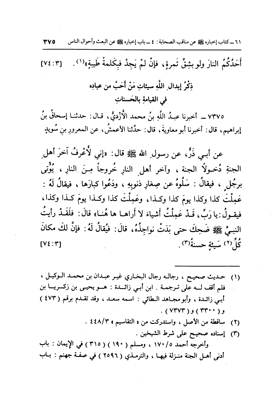 7375- أَخْبَرَنَا عَبْدُ اللَّهِ بْنُ مُحَمَّدٍ الْأَزْدِيُّ قَالَ: حَدَّثَنَا إِسْحَاقُ بْنُ إِبْرَاهِيمَ قَالَ: أَخْبَرَنَا أَبُو مُعَاوِيَةَ قَالَ: حَدَّثَنَا الْأَعْمَشُ عَنِ الْمَعْرُورِ بْنِ سُوَيْدٍ عَنْ أَبِي ذَرٍّ عَنْ رَسُولِ اللَّهِ صَلَّى اللَّهُ عَلَيْهِ وَسَلَّمَ قَالَ: "إِنِّي لَأَعْرِفُ آخِرَ أَهْلِ الْجَنَّةِ دُخُولًا الْجَنَّةَ وَآخِرَ أَهْلِ النَّارِ خُرُوجًا مِنَ النَّارِ يُؤْتَى بِرَجُلٍ فَيُقَالُ: سَلُوهُ عَنْ صِغَارِ ذُنُوبِهِ وَدَعُوا كِبَارَهَا, فَيُقَالُ لَهُ: عَمِلْتَ كَذَا وَكَذَا يَوْمَ كَذَا وَكَذَا وَعَمِلْتَ كَذَا وَكَذَا يَوْمَ كَذَا وَكَذَا فَيَقُولُ: يَا رَبِّ قَدْ عَمِلْتُ أَشْيَاءَ لَا أَرَاهَا هَاهُنَا" قَالَ: فَلَقَدْ رَأَيْتُ النَّبِيَّ صَلَّى اللَّهُ عَلَيْهِ وَسَلَّمَ ضَحِكَ حَتَّى بَدَتْ نَوَاجِذُهُ, قَالَ: "فَيُقَالُ لَهُ فَإِنَّ لك مكان كل 1 سيئة حسنة 2. [3: 74]