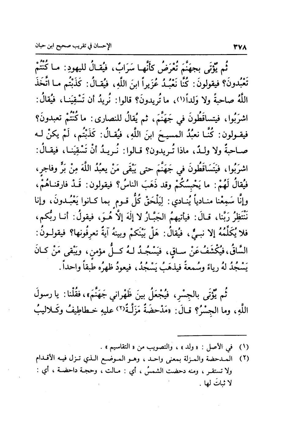ثم يؤتى بالجسر فَيُجْعَلُ بَيْنَ ظَهْرَانِي جَهَنَّمَ"، فَقُلْنَا: يَا رَسُولَ اللَّهِ وَمَا الْجِسْرُ؟ قَالَ: "مَدْحَضَةٌ مَزَلَّةٌ 2 عَلَيْهِ خطاطيف وكلاليب