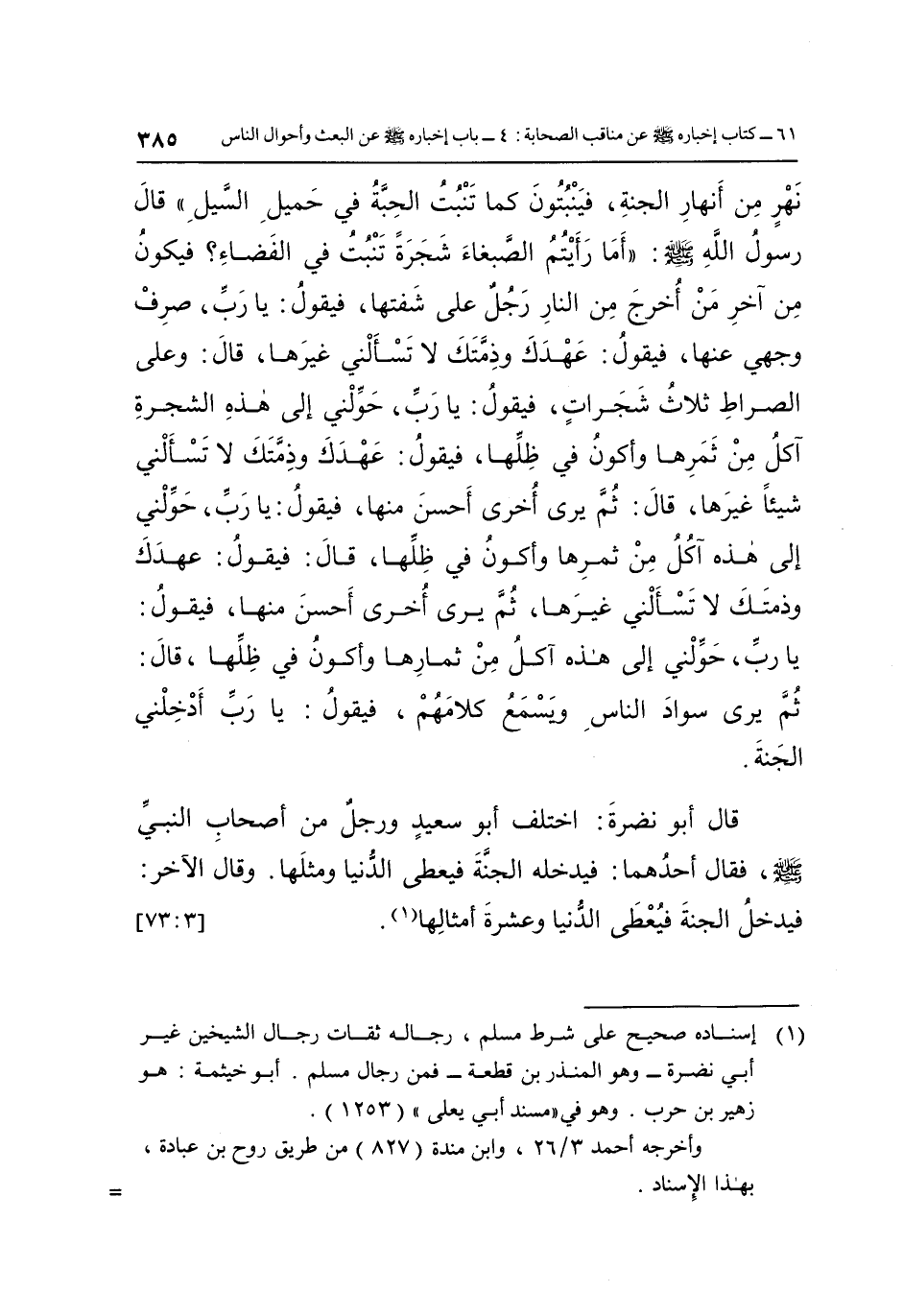 نَهَرٍ مِنْ أَنْهَارِ الْجَنَّةِ فَيَنْبُتُونَ كَمَا تَنْبُتُ الْحَبَّةُ فِي حَمِيلِ السَّيْلِ". قَالَ رَسُولُ اللَّهِ صَلَّى اللَّهُ عَلَيْهِ وَسَلَّمَ: "أَمَا رَأَيْتُمُ الصَّبْغَاءَ شَجَرَةً تَنْبُتُ فِي الْفَضَاءِ؟ فَيَكُونُ مِنْ آخِرِ مَنَ أُخْرِجَ مِنَ النَّارِ رَجُلٌ عَلَى شَفَتِهَا فَيَقُولُ: يَا رَبِّ صَرِّفْ وَجْهِي عَنْهَا, فَيَقُولُ: عَهْدَكَ وَذِمَّتَكَ لَا تَسْأَلْنِي غَيْرَهَا قَالَ: وَعَلَى الصِّرَاطِ ثَلَاثُ شَجَرَاتٍ, فَيَقُولُ: يَا رَبِّ حَوِّلْنِي إِلَى هَذِهِ الشَّجَرَةِ آكُلُ مِنْ ثَمَرِهَا وَأَكُونُ فِي ظِلِّهَا فَيَقُولُ: عَهْدَكَ وَذِمَّتَكَ لَا تَسْأَلْنِي شَيْئًا غَيْرَهَا, قَالَ: ثُمَّ يَرَى أُخْرَى أَحْسَنَ مِنْهَا فَيَقُولُ: يَا رَبِّ حَوِّلْنِي إِلَى هَذِهِ آكُلُ مِنْ ثَمَرِهَا وَأَكُونُ فِي ظِلِّهَا, قَالَ: فَيَقُولُ: عَهْدَكَ وَذِمَّتَكَ لَا تَسْأَلْنِي غَيْرَهَا ثُمَّ يَرَى أُخْرَى أَحْسَنَ مِنْهَا فَيَقُولُ: يَا رَبِّ حَوِّلْنِي إِلَى هَذِهِ آكُلُ مِنْ ثِمَارِهَا وَأَكُونُ فِي ظِلِّهَا, قَالَ: ثُمَّ يَرَى سَوَادَ النَّاسِ وَيَسْمَعُ كَلَامَهُمْ فَيَقُولُ: يَا رَبِّ أَدْخِلْنِي الْجَنَّةَ".