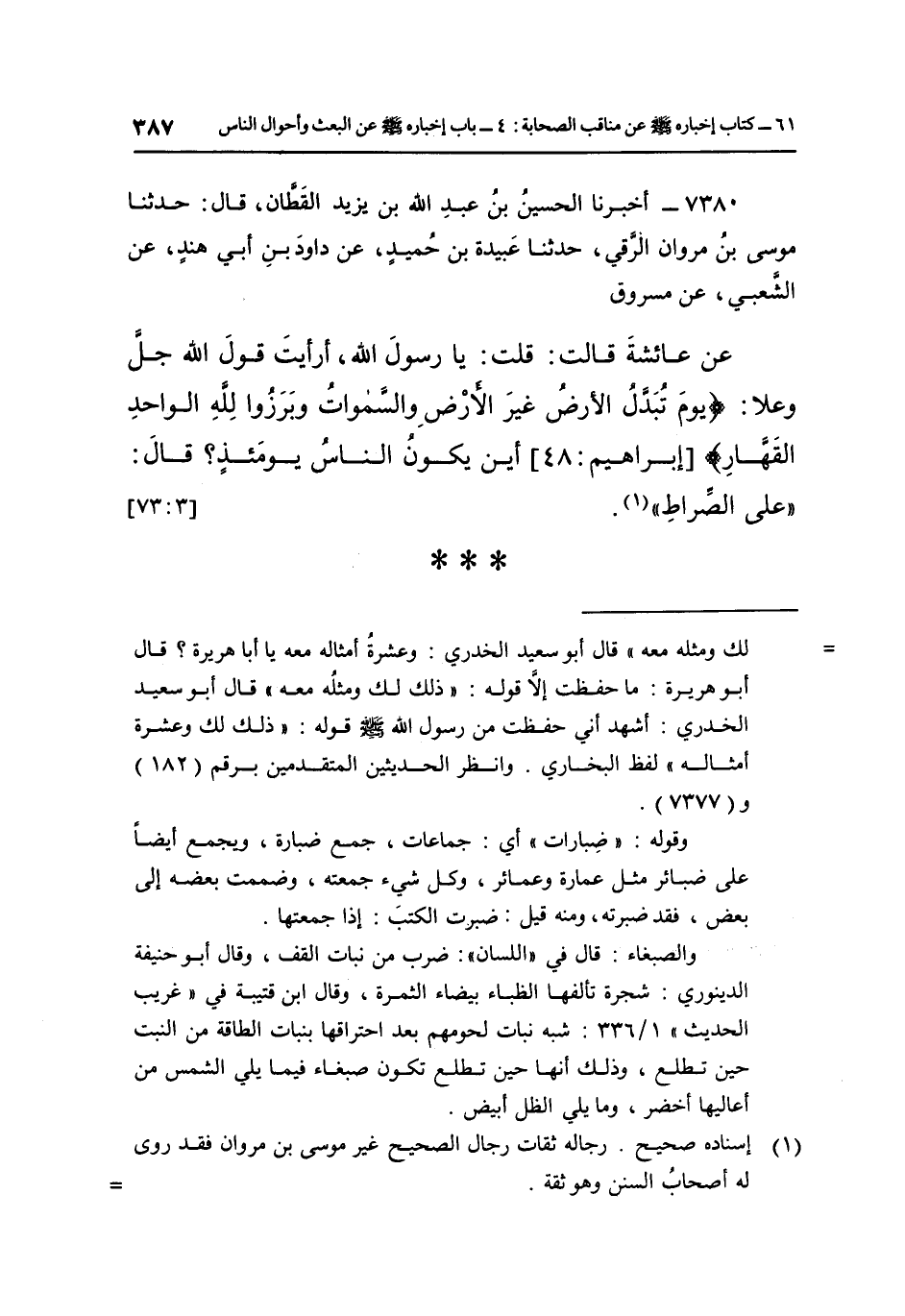 7380- أَخْبَرَنَا الْحُسَيْنُ بْنُ عَبْدِ اللَّهِ بْنِ يَزِيدَ الْقَطَّانُ قَالَ: حَدَّثَنَا مُوسَى بْنُ مَرْوَانَ الرَّقِّيُّ حَدَّثَنَا عَبِيدَةُ بْنُ حُمَيْدٍ عَنْ دَاوُدَ بْنِ أَبِي هِنْدٍ عَنِ الشَّعْبِيِّ عَنِ مَسْرُوقٍ عَنْ عَائِشَةَ قَالَتْ: قُلْتُ: يَا رَسُولَ اللَّهِ أَرَأَيْتَ قَوْلَ اللَّهِ جَلَّ وَعَلَا: {يَوْمَ تُبَدَّلُ الْأَرْضُ غَيْرَ الْأَرْضِ وَالسَّمَاوَاتُ وَبَرَزُوا لِلَّهِ الْوَاحِدِ الْقَهَّارِ} [إبراهيم: 48] أَيْنَ يَكُونُ النَّاسُ يَوْمَئِذٍ؟ قَالَ: "عَلَى الصِّرَاطِ" 1. [3: 73]