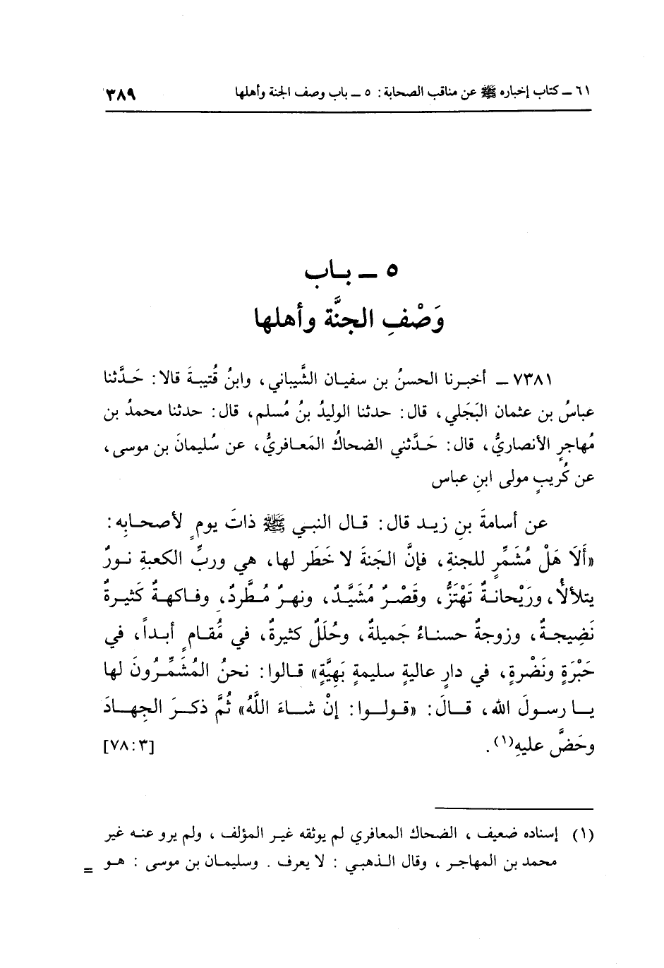 7381- أَخْبَرَنَا الْحَسَنُ بْنُ سُفْيَانَ الشَّيْبَانِيُّ وَابْنُ قُتَيْبَةَ قَالَا: حَدَّثَنَا عَبَّاسُ بْنُ عُثْمَانَ الْبَجَلِيُّ قَالَ: حَدَّثَنَا الْوَلِيدُ بْنُ مُسْلِمٍ قَالَ: حَدَّثَنَا مُحَمَّدُ بْنُ مُهَاجِرٍ الْأَنْصَارِيُّ قَالَ: حَدَّثَنِي الضَّحَّاكُ الْمَعَافِرِيُّ عَنْ سُلَيْمَانَ بْنِ مُوسَى عَنْ كُرَيْبٍ مَوْلَى ابْنِ عَبَّاسٍ عَنْ أُسَامَةَ بْنِ زَيْدٍ قَالَ: قَالَ النَّبِيُّ صَلَّى الله عليه وسلمذات يَوْمٍ لِأَصْحَابِهِ: "أَلَا هَلْ مُشَمِّر لِلْجَنَّةِ فَإِنَّ الْجَنَّةَ لَا خَطَرَ لَهَا هِيَ وَرَبِّ الْكَعْبَةِ نُورٌ يَتَلَأْلَأُ وَرَيْحَانَةٌ تَهْتَزُّ وَقَصْرٌ مُشَيَّدٌ وَنَهْرٌ مُطَّرِدٌ وَفَاكِهَةٌ كَثِيرَةٌ نَضِيجَةٌ وَزَوْجَةٌ حَسْنَاءُ جَمِيلَةٌ وَحُلَلٌ كَثِيرَةٌ فِي مَقَامٍ أَبَدًا فِي حَبْرَةٍ وَنَضْرَةٍ فِي دَارٍ عَالِيَةٍ سَلِيمَةٍ بَهِيَّةٍ", قَالُوا: نَحْنُ الْمُشَمِّرُونَ لَهَا يَا رَسُولَ اللَّهِ قَالَ: "قُولُوا: إِنْ شَاءَ اللَّهُ", ثُمَّ ذَكَرَ الْجِهَادَ وحض عليه1. [3: 78]