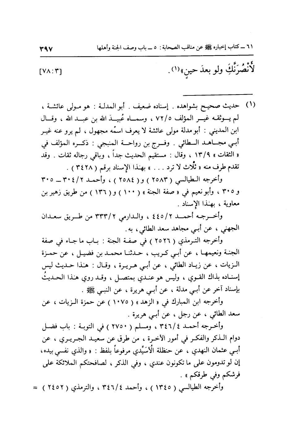 وأخرجه الترمذي"2526"في صفة الجنة: باب ماجاء في صفة الجنة ونعيمها، عن أبي كريب، حدثنا محمد بن فضيل، عن حمزة الزيات، عن زياد الطائي، عن أبي هريرة، وقال: هذا حديث ليس إسناده بذاك القوي، وليس هو عندي بمتصل، وقد روى هذا الحديث بإسناده آخر عن أبي مدلة، عن أبي هريرة، عن النبي صلى الله عليه وسلم.