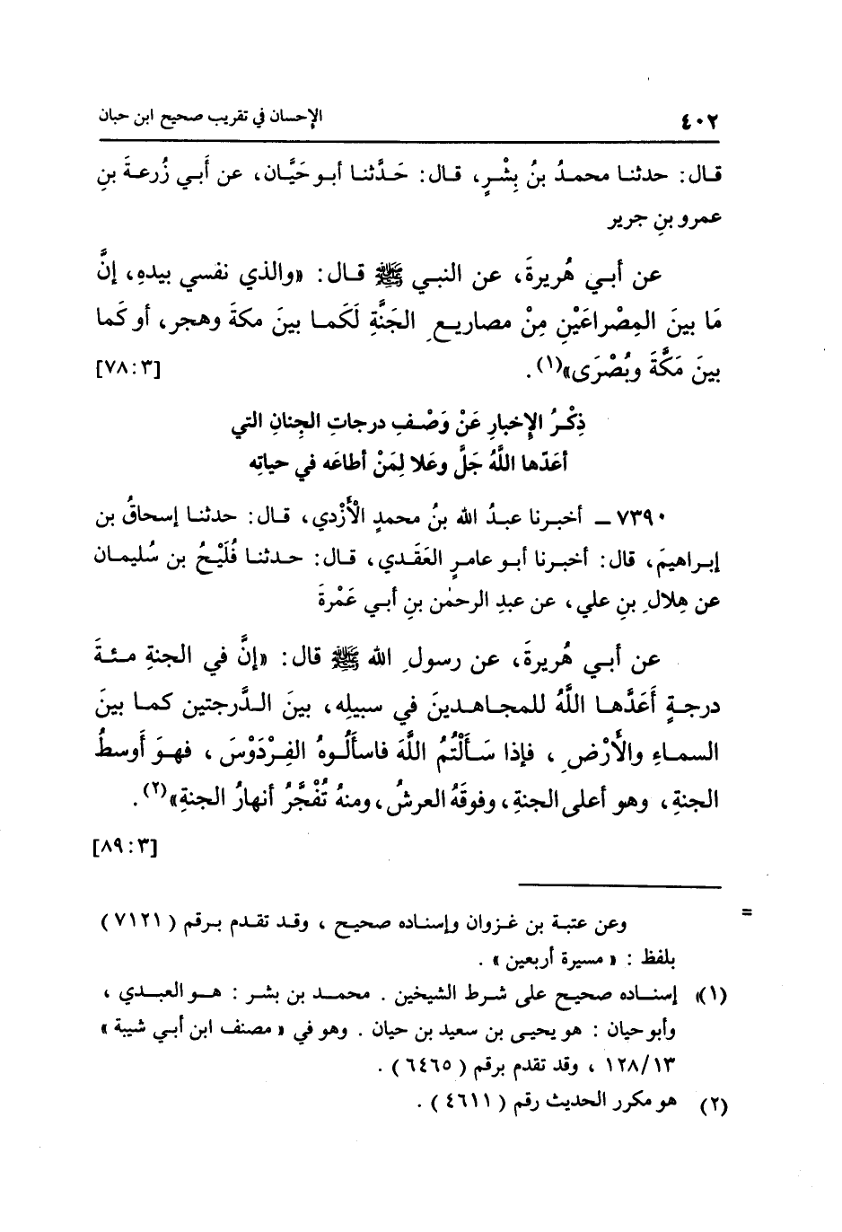 قَالَ: حَدَّثَنَا مُحَمَّدُ بْنُ بِشْرٍ قَالَ: حَدَّثَنَا أَبُو حَيَّانَ عَنْ أَبِي زُرْعَةَ بْنِ عَمْرِو بْنِ جَرِيرٍ عَنْ أَبِي هُرَيْرَةَ عَنِ النَّبِيِّ صَلَّى اللَّهُ عَلَيْهِ وَسَلَّمَ قَالَ: "وَالَّذِي نَفْسِي بِيَدِهِ إِنَّ مَا بَيْنَ الْمِصْرَاعَيْنِ مِنْ مَصَارِيعِ الْجَنَّةِ لَكَمَا بَيْنَ مَكَّةَ وَهَجَرَ أَوْ كَمَا بين مكة وبصرى" 1. [3: 78]