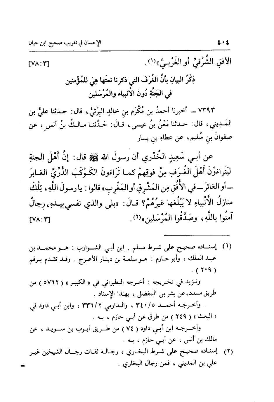 7393- أَخْبَرَنَا أَحْمَدُ بْنُ مُكْرَمِ بْنِ خَالِدٍ الْبِرْتِيُّ قَالَ: حَدَّثَنَا عَلِيُّ بْنُ الْمَدِينِيِّ قَالَ: حَدَّثَنَا مَعْنُ بْنُ عِيسَى قَالَ: حَدَّثَنَا مَالِكُ بْنُ أَنَسٍ عَنْ صَفْوَانَ بْنِ سُلَيْمٍ عَنْ عَطَاءِ بْنِ يَسَارٍ عَنْ أَبِي سَعِيدٍ الْخُدْرِيِّ أَنَّ رَسُولَ اللَّهِ صَلَّى اللَّهُ عَلَيْهِ وسلم قال: "إِنَّ أَهْلَ الْجَنَّةِ لَيَتَرَاءَوْنَ أَهْلَ الْغُرَفِ مِنْ فَوْقِهِمْ كَمَا تَرَاءَوْنَ الْكَوْكَبَ الدُّرِّيَّ الْغَابِرَ -أَوِ الغائر- في الأفق من المشرق أوالمغرب"، قَالُوا: يَا رَسُولَ اللَّهِ تِلْكَ مَنَازِلُ الْأَنْبِيَاءِ لَا يَبْلُغُهَا غَيْرُهُمْ؟ قَالَ: "بَلَى وَالَّذِي نَفْسِي بيده رجال آمنوا بالله وصدقوا المرسلين" 1. [3: 78]