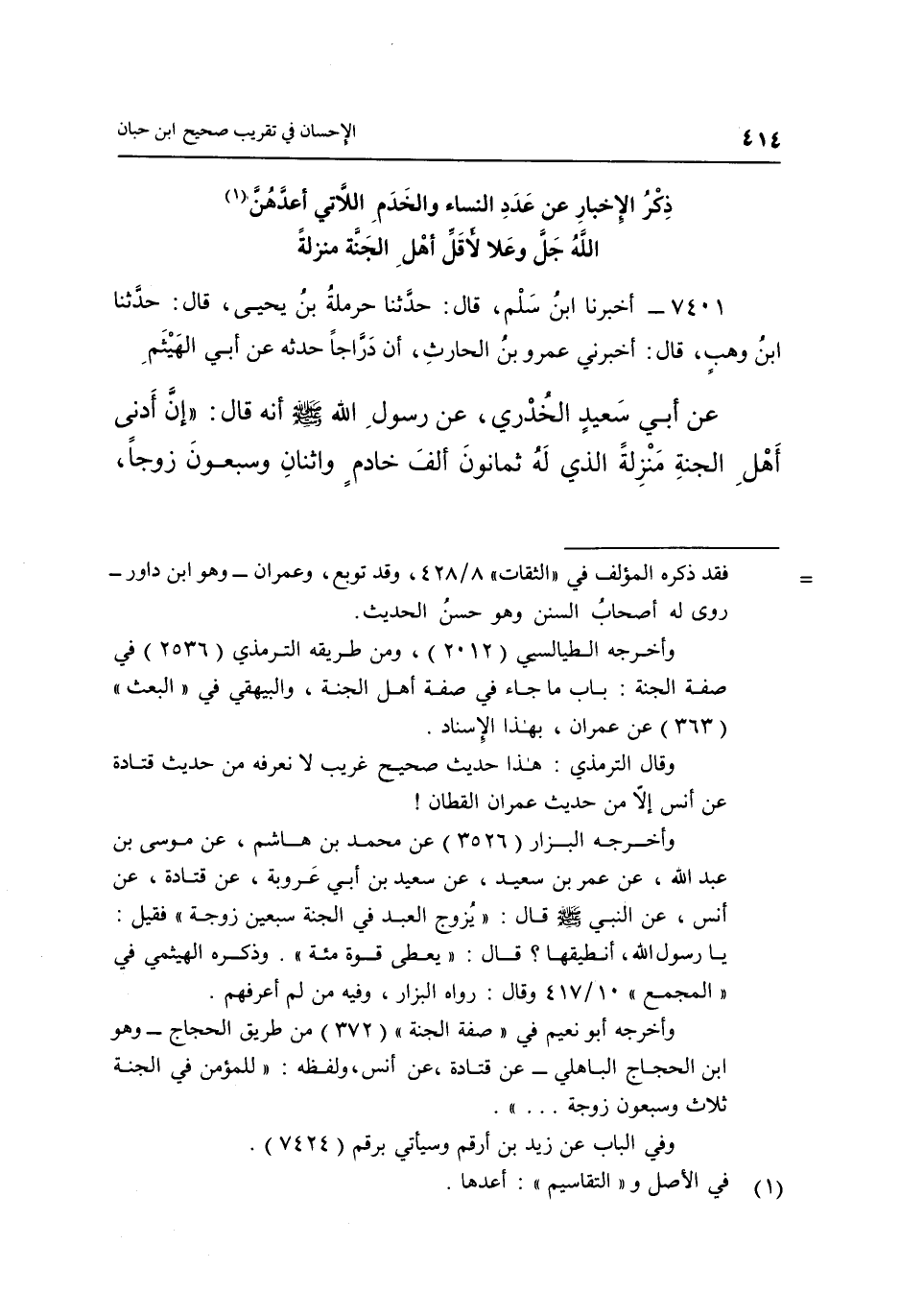 7401- أَخْبَرَنَا ابْنُ سَلْمٍ قَالَ: حَدَّثَنَا حَرْمَلَةُ بْنُ يَحْيَى قَالَ: حَدَّثَنَا ابْنُ وَهْبٍ قَالَ: أَخْبَرَنِي عَمْرُو بْنُ الْحَارِثِ أَنَّ دَرَّاجًا حَدَّثَهُ عَنْ أَبِي الْهَيْثَمِ عَنْ أَبِي سَعِيدٍ الْخُدْرِيِّ عَنْ رَسُولِ اللَّهِ صَلَّى اللَّهُ عَلَيْهِ وَسَلَّمَ أَنَّهُ قَالَ: "إِنَّ أَدْنَى أَهْلِ الْجَنَّةِ مَنْزِلَةً الَّذِي لَهُ ثَمَانُونَ ألف خادم واثنان وسبعون زوجا،