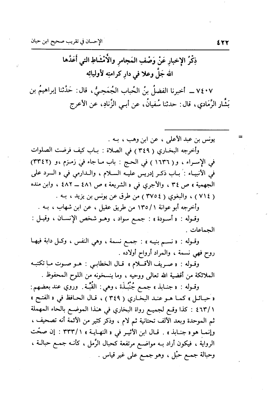 7407- أَخْبَرَنَا الْفَضْلُ بْنُ الْحُبَابِ الْجُمَحِيُّ قَالَ: حَدَّثَنَا إِبْرَاهِيمُ بْنُ بَشَّارٍ الرَّمَادِيُّ قَالَ: حَدَّثَنَا سُفْيَانُ عَنْ أَبِي الزِّنَادِ عَنِ الْأَعْرَجِ