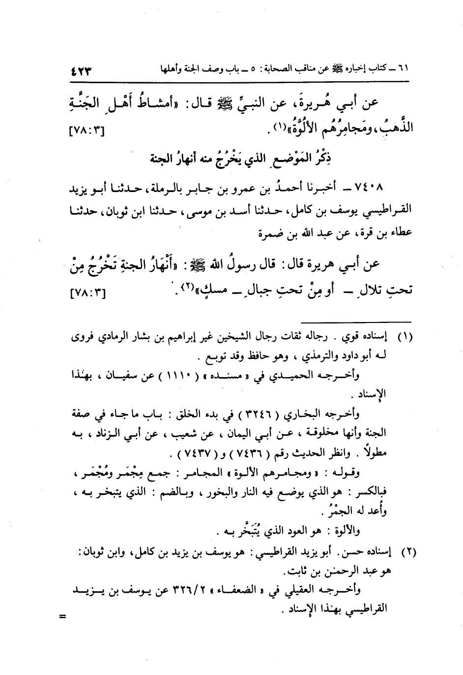 7408- أَخْبَرَنَا أَحْمَدُ بْنُ عَمْرِو بْنِ جَابِرٍ بِالرَّمْلَةِ حَدَّثَنَا أَبُو يَزِيدَ الْقَرَاطِيسِيُّ يُوسُفُ بْنُ كَامِلٍ حَدَّثَنَا أَسَدُ بْنُ مُوسَى حَدَّثَنَا أَبُو ثَوْبَانَ حَدَّثَنَا عَطَاءُ بْنُ قُرَّةَ عَنْ عَبْدِ اللَّهِ بْنِ ضَمْرَةَ عَنْ أَبِي هُرَيْرَةَ قَالَ: قَالَ رَسُولُ اللَّهِ صَلَّى اللَّهُ عَلَيْهِ وَسَلَّمَ: "أَنْهَارُ الْجَنَّةِ تَخْرُجُ مِنْ تَحْتِ تِلَالِ - أَوْ مِنْ تحت جبال - مسك" 1. [3: 78]