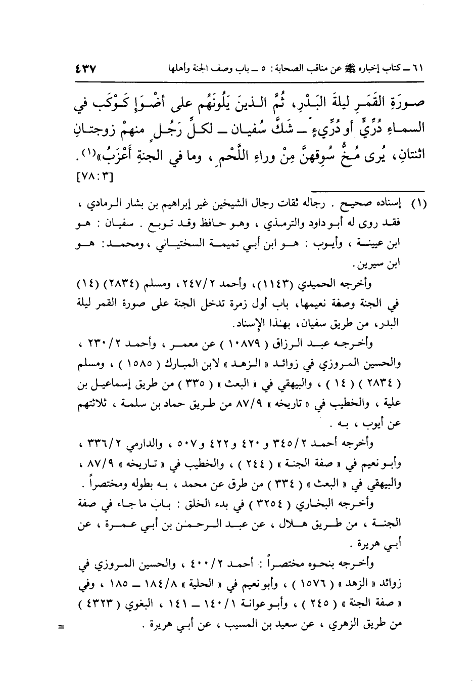 صُورَةِ الْقَمَرِ لَيْلَةَ الْبَدْرِ ثُمَّ الَّذِينَ يَلُونَهُمْ عَلَى أَضْوَأِ كَوْكَبٍ فِي السَّمَاءِ دُرِّيٍّ أَوْ دُرِّيءٍ -شَكَّ سُفْيَانُ- لِكُلِّ رَجُلٍ مِنْهُمْ زَوْجَتَانِ اثْنَتَانِ يُرَى مُخُّ سُوقِهِنَّ مِنْ وَرَاءِ اللَّحْمِ وما في الجنة أعزب" 1. [3: 78]